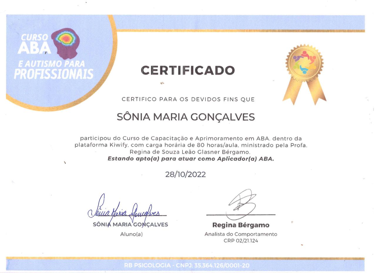 Quais são as principais especialidades de Sônia Maria Gonçalves de Melo?Sônia Maria Gonçalves de Melo é psicóloga. Te mostramos alguns dos serviços oferecidos pelo especialista graças à sua trajetória e vasta experiência: Teleconsulta, Análise do Comportamento Aplicada (ABA), Tratamento da ansiedade, Anamnese psicológica, Psicoterapia, Primeira consulta psicologia, Tratamento da depressão, Avaliação psicológica, Acompanhamento de transtorno de TDAH, Terapia para depressão.