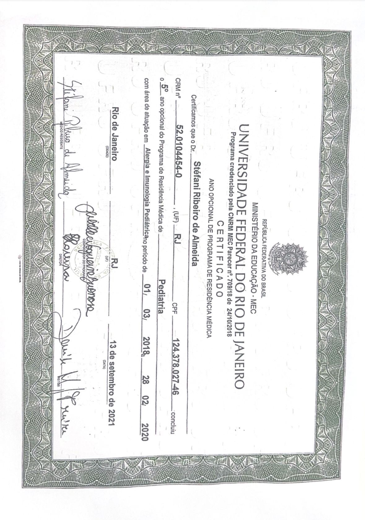Quais são as principais especialidades de Stéfani Ribeiro de Almeida?Stéfani Ribeiro de Almeida é alergista, pediatra. Te mostramos alguns dos serviços oferecidos pelo especialista graças à sua trajetória e vasta experiência: Teleconsulta, Primeira consulta Alergia e Imunologia.