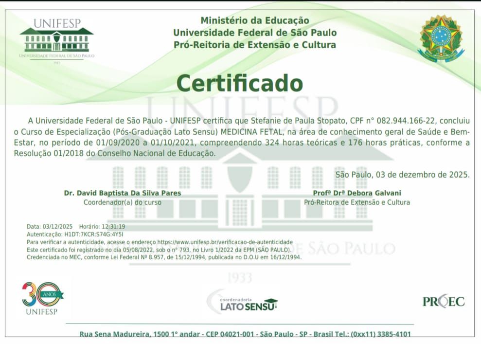 Buscando sempre atualização e aprofundamento técnico, em 2021 concluí a Pós-graduação em Medicina Fetal pela Fundação de Medicina Fetal da América Latina (FMF-LA), com foco no acompanhamento de gestação de alto risco e alterações materno-fetais.