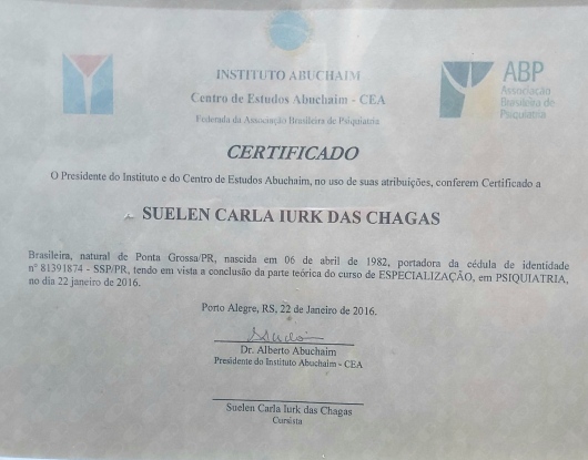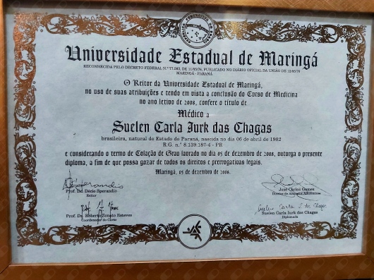 Tenho enorme orgulho por ter formado na UEM, na época uma das melhores e mais conceituadas do Brasil. Fazer Psiquiatria e psicoterapia no berço da psicanálise, com grandes mestres, TCC com nota 10, ser convidada pra trabalhar com meus professores foi extremamente honroso. Entre toda esta busca tanto da inteligência racional quanto da inteligência emocional, com objetivo de tentar unir ambos e que cheguei até aqui para poder ser o melhor para você que precisa de mim.