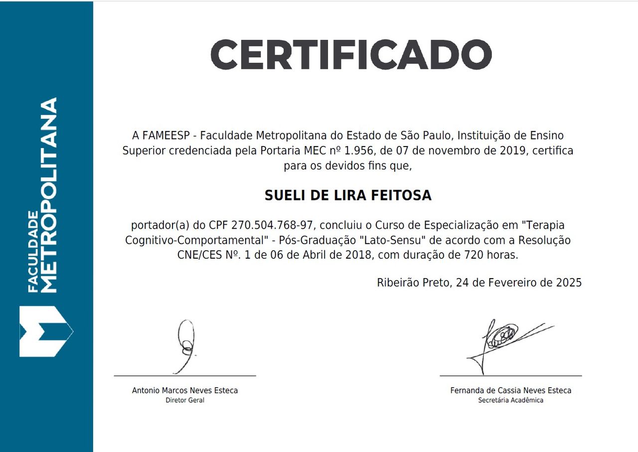 Meu compromisso profissional é oferecer um atendimento ético, acolhedor e tecnicamente fundamentado, criando um espaço seguro de escuta e reflexão. Acredito que compreender como pensamos, sentimos e reagimos é um passo essencial para promover mudanças consistentes e construir formas mais saudáveis de lidar com os desafios da vida.