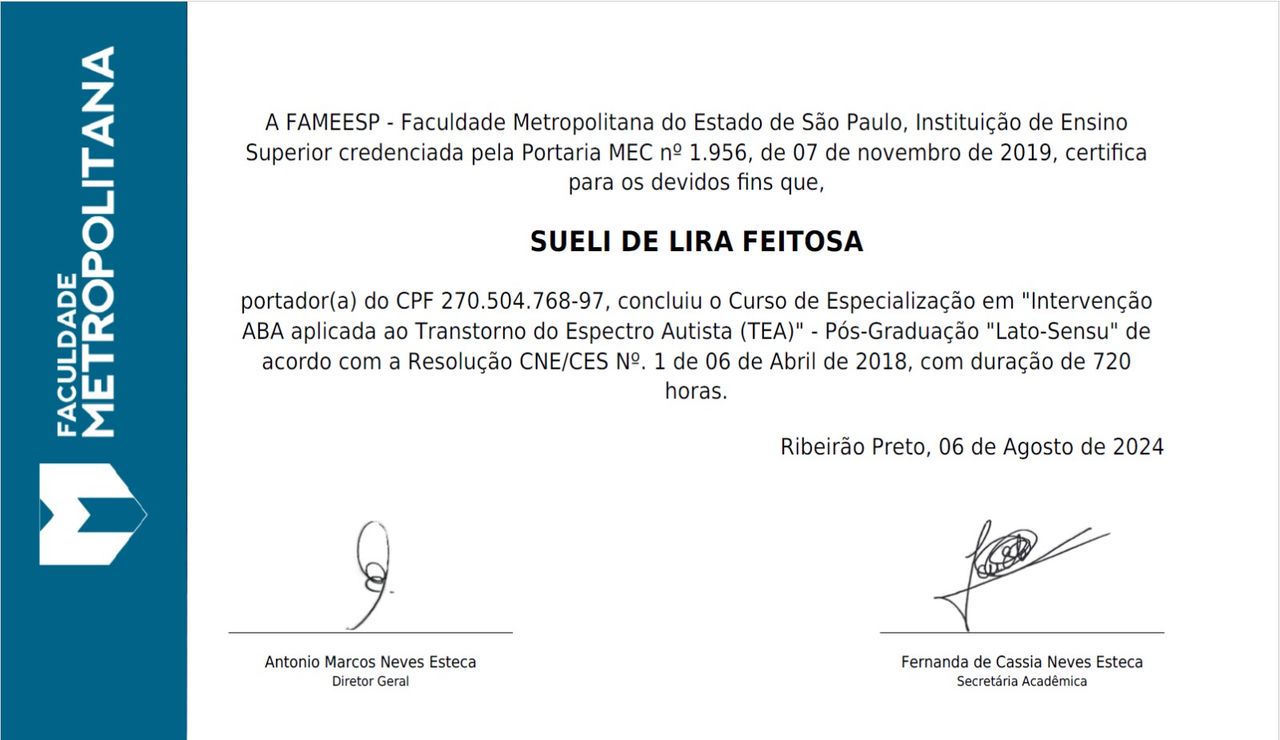 Sou Psicóloga Clínica (CRP 06/197546), especialista em Neuropsicologia e Terapia Cognitivo-Comportamental (TCC). Meu trabalho é voltado para a compreensão aprofundada do funcionamento emocional e cognitivo, auxiliando pessoas que enfrentam dificuldades como ansiedade, problemas de atenção, memória, organização mental e questões relacionadas aos transtornos do neurodesenvolvimento.
