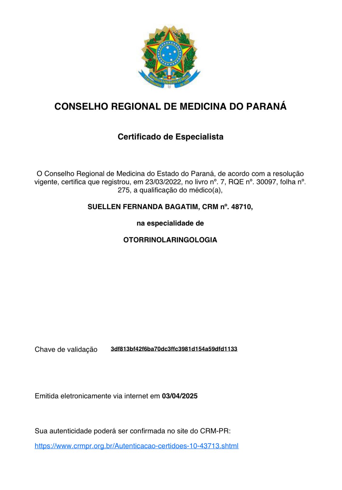 Quais são as principais especialidades de Suellen Fernanda Bagatim?Suellen Fernanda Bagatim é otorrino. Te mostramos alguns dos serviços oferecidos pelo especialista graças à sua trajetória e vasta experiência: Amigdalectomia, Cirurgia de sinusite, Rinoplastia, Cirurgia estética no nariz, Retirada de objetos no nariz, Videolaringoscopia, Nasofibroscopia, Tratamento de ronco para crianças, Aspiração de ouvido, Lavagem ouvido (limpeza rolha cerúmen).