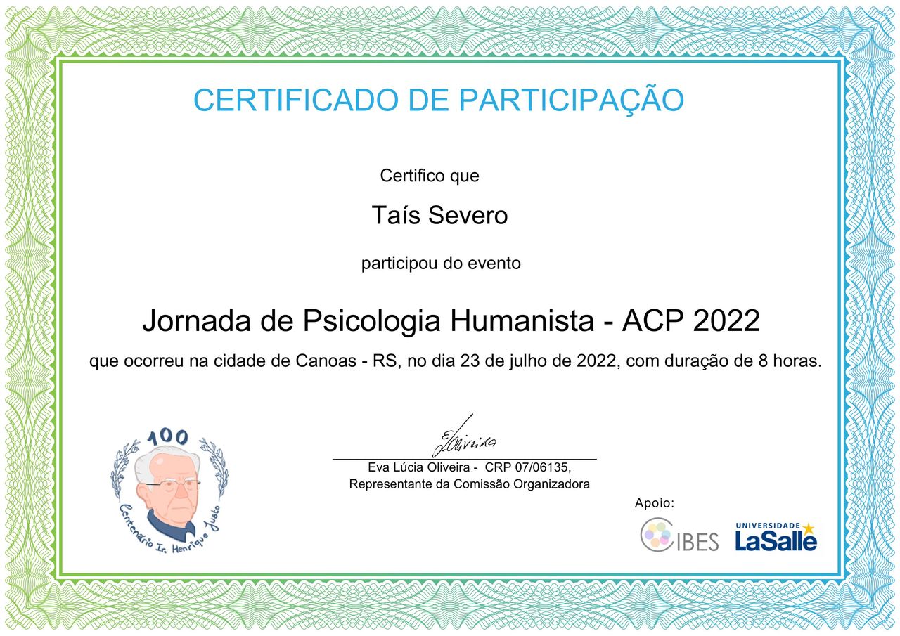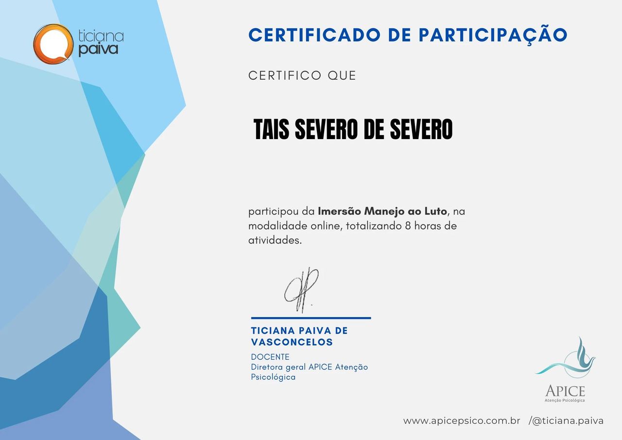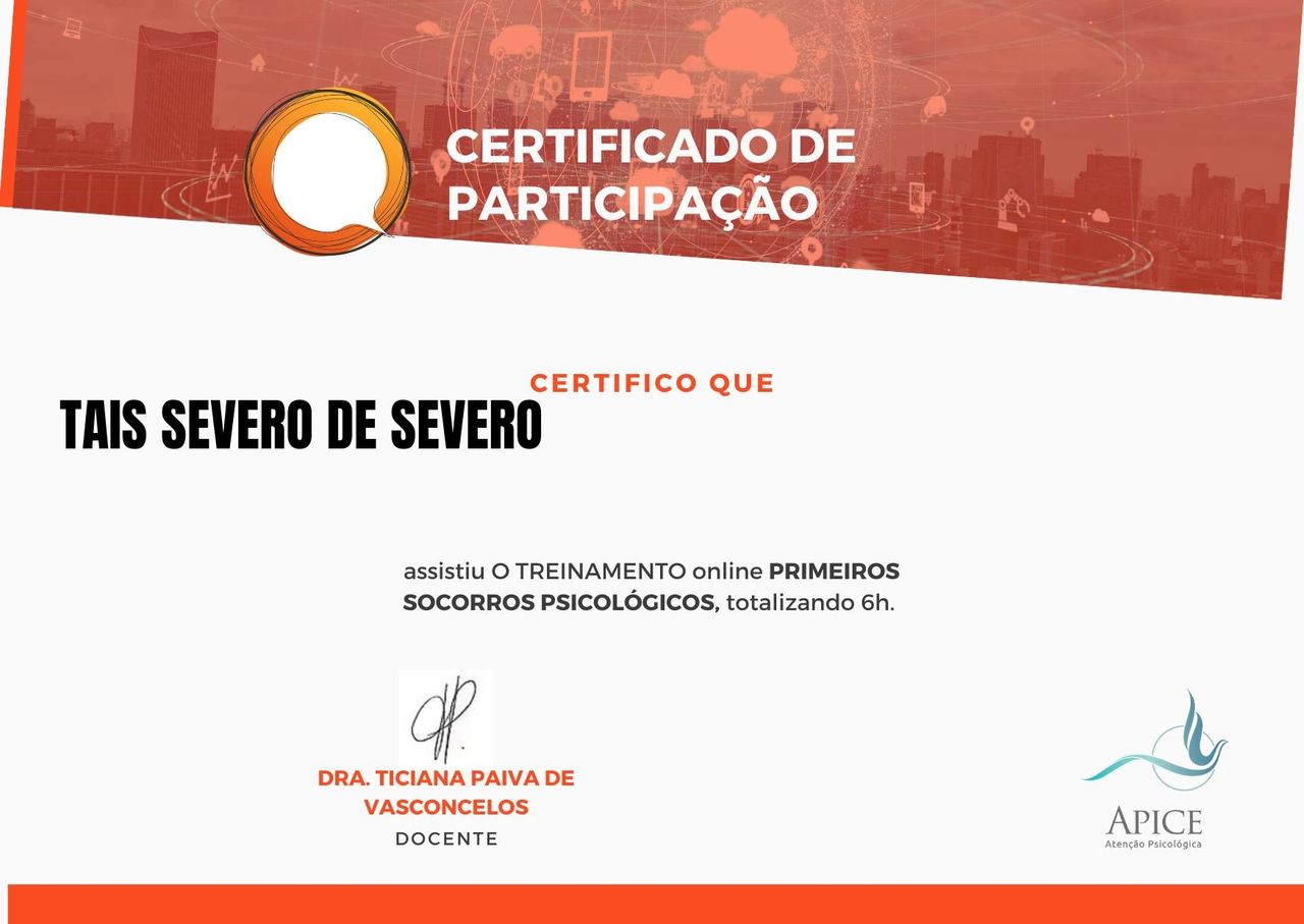 Também possuo curso de Formação e Mentoria para intervenção aos Sofrimentos Extremos pelo Centro Universitário Unifacear - Polo Araucária Centro e APICE - Atenção Psicológica.