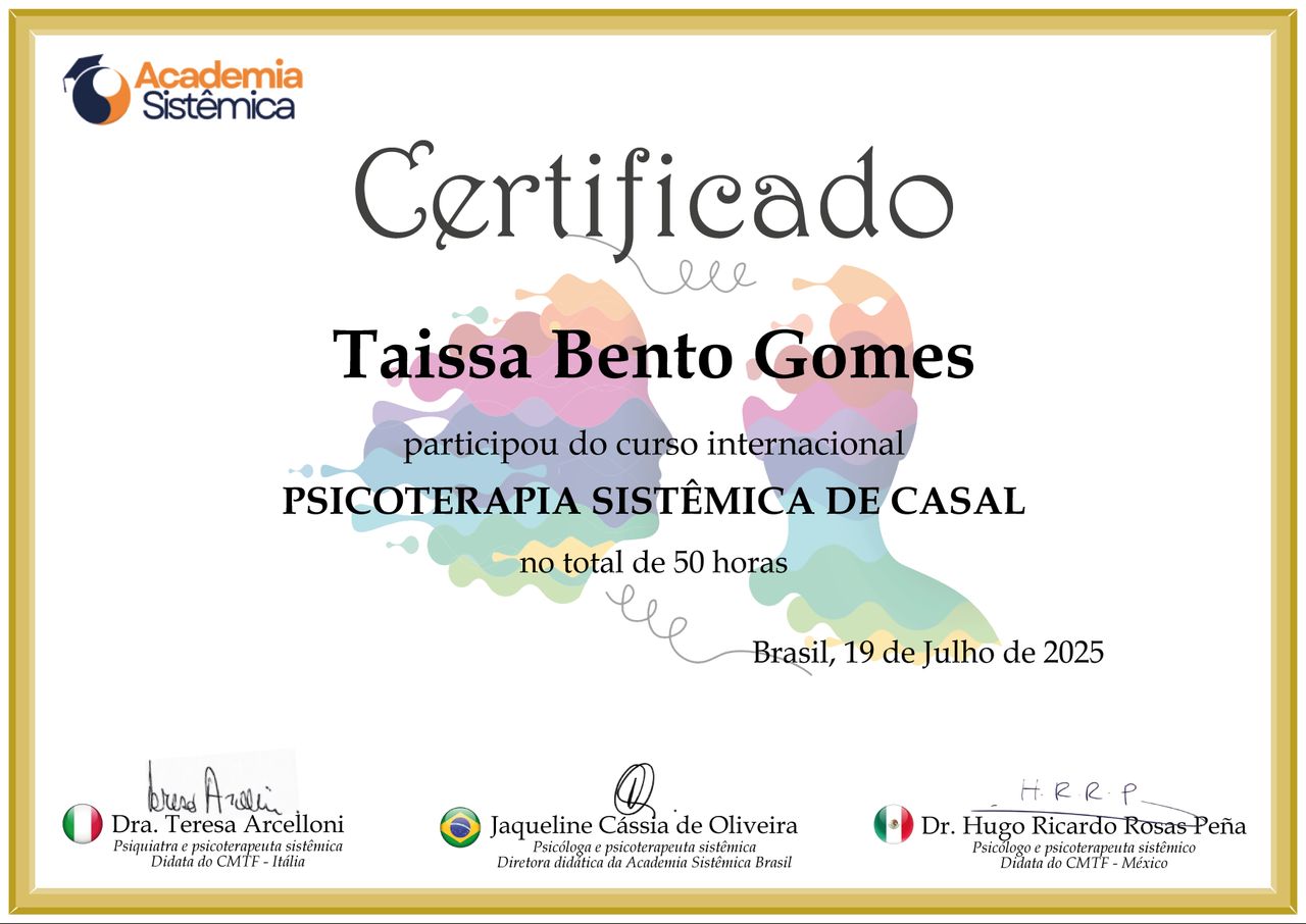 Quais são as principais especialidades de Taissa Bento Gomes?Taissa Bento Gomes é psicóloga, sexóloga. Te mostramos alguns dos serviços oferecidos pelo especialista graças à sua trajetória e vasta experiência: Terapia de Casal, Consulta em sexologia clínica, Educação sexual, Terapia sexual.
