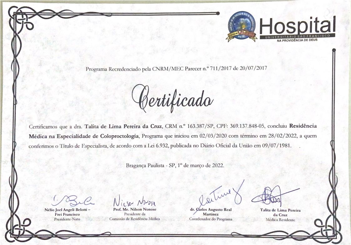 Quais são as principais especialidades de Talita Cruz?Talita Cruz é coloproctologista. Te mostramos alguns dos serviços oferecidos pelo especialista graças à sua trajetória e vasta experiência: Primeira consulta Coloproctologia, Tratamento de constipação intestinal, Excisao De Tumor Retal Per Anus, Excisao De Lesao Anal, Esfincterotomia Interna E Tratamento De Fissura Anal, Esfincteroplastia Anal, Colostomia Por Cancer, Colectomia parcial (hemicolectomia), Incisao E Drenagem De Abscesso Anal, Fistulectomia Ou Fistulotomia Anal.