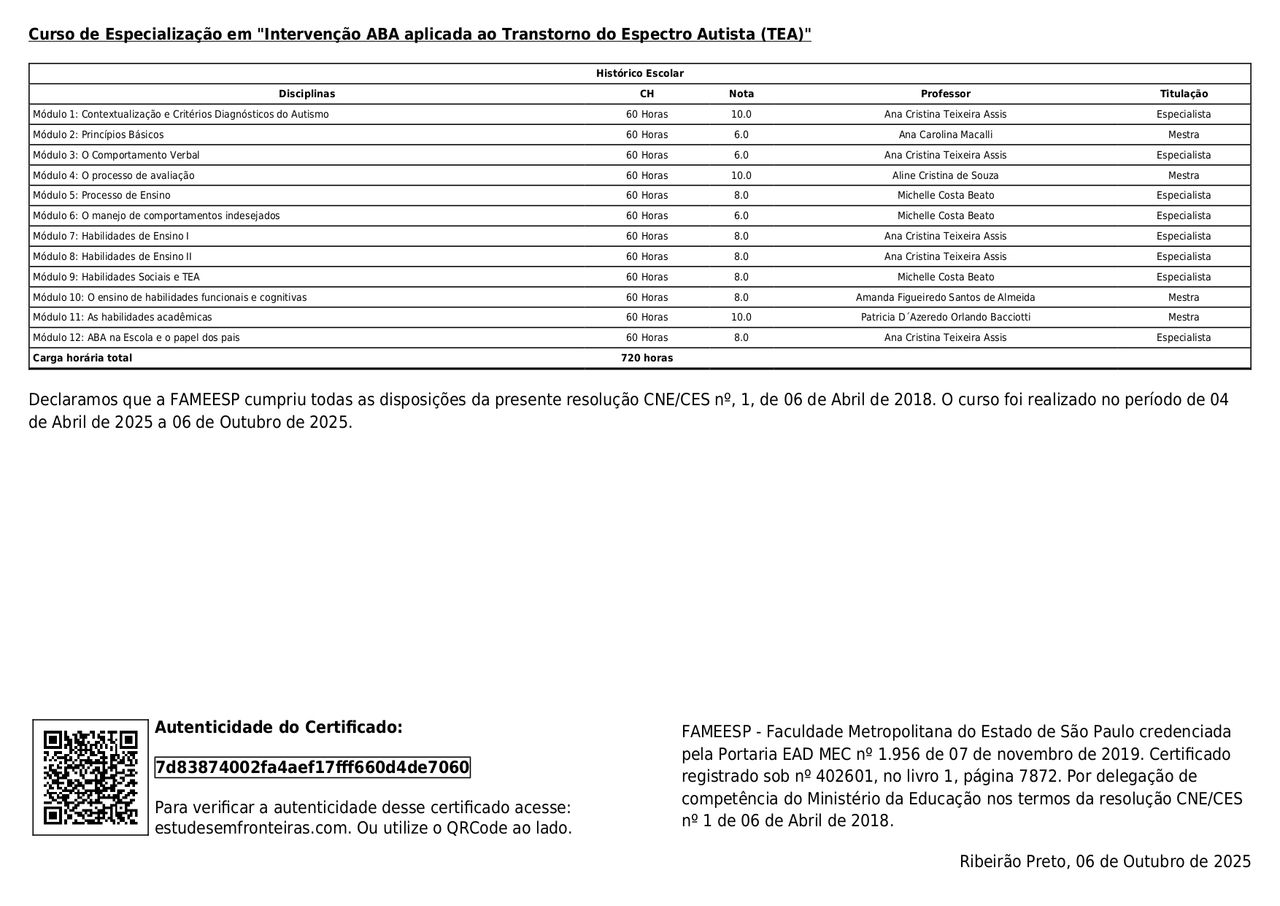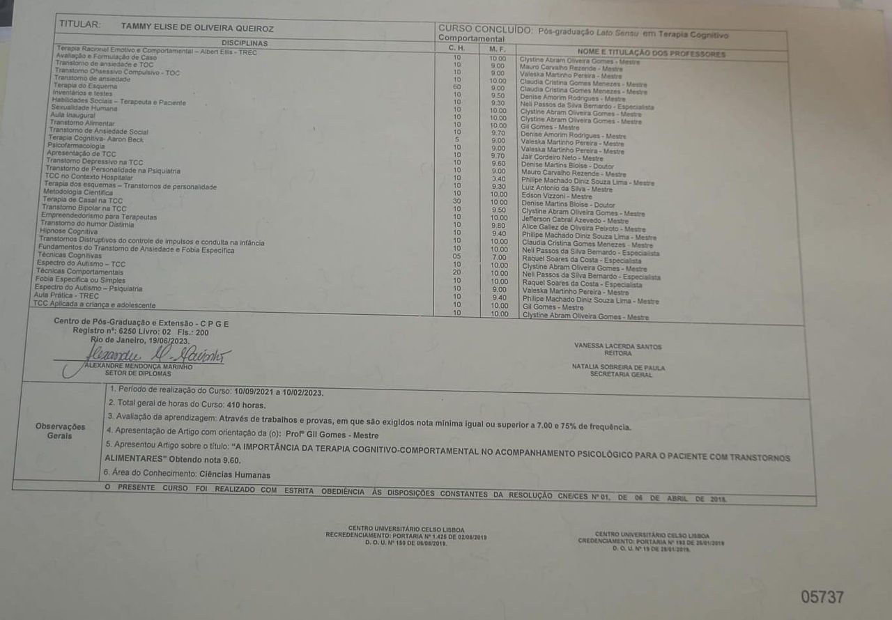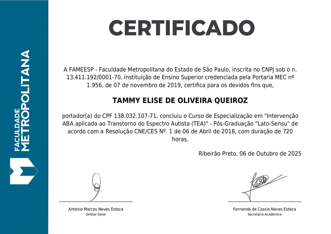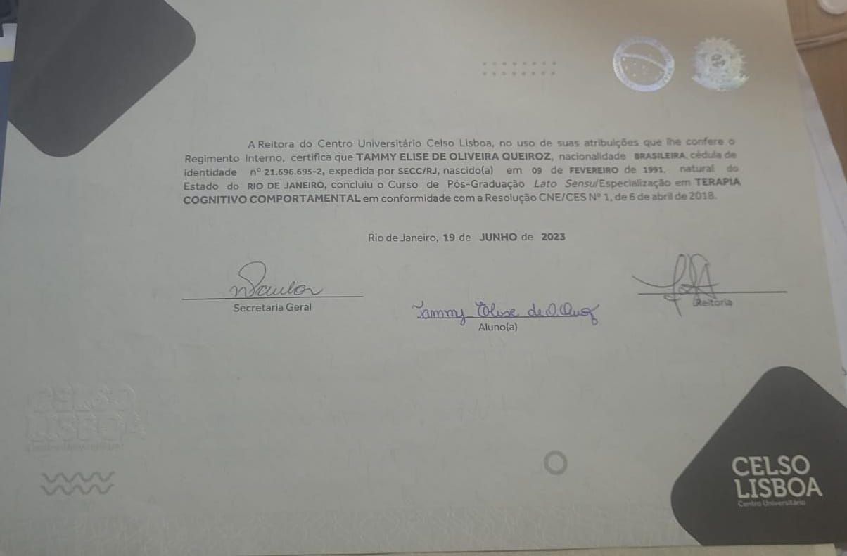 Hoje sou Especialista em Análise do Comportamento Aplicada (ABA) e Terapia Cognitivo-Comportamental (TCC).