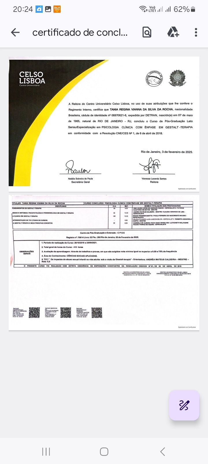 Quais são as principais especialidades de Tania Regina Vianna da Silva da Rocha ?Tania Regina Vianna da Silva da Rocha é psicóloga. Te mostramos alguns dos serviços oferecidos pelo especialista graças à sua trajetória e vasta experiência: Primeira consulta psicologia, Teleconsulta, Tratamento da ansiedade, Acompanhamento de transtorno de TDAH, Tratamento da depressão, Psicoterapia, Terapia da Gestalt, Anamnese.