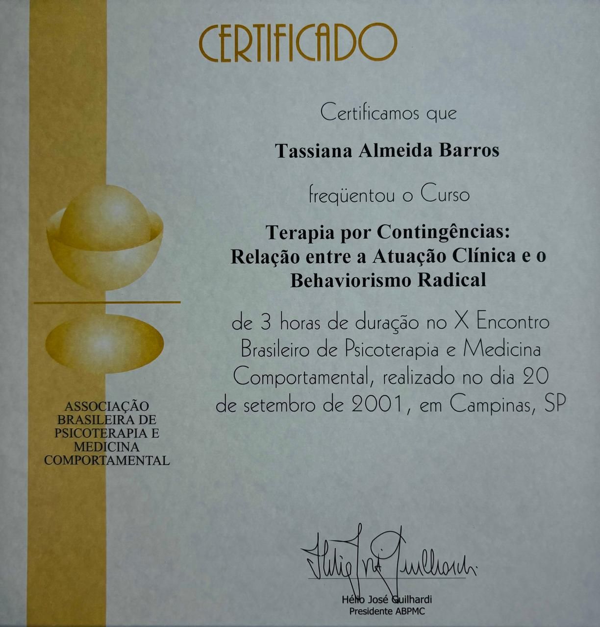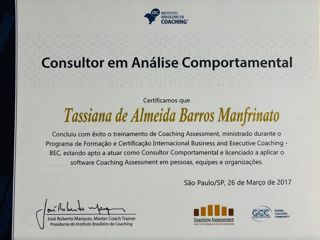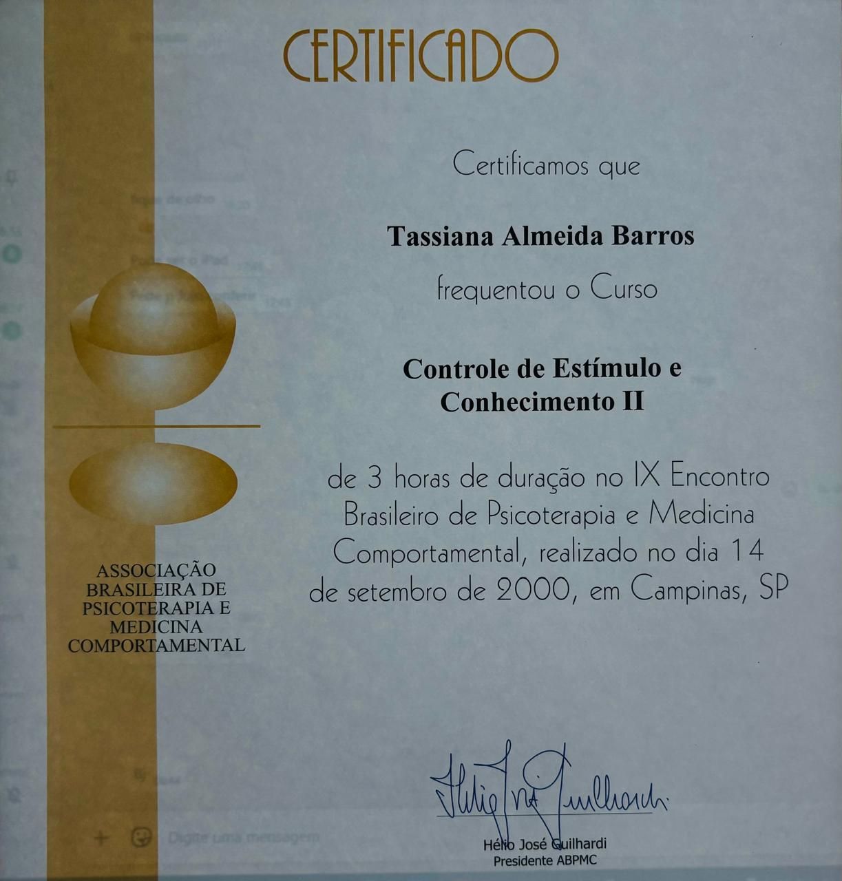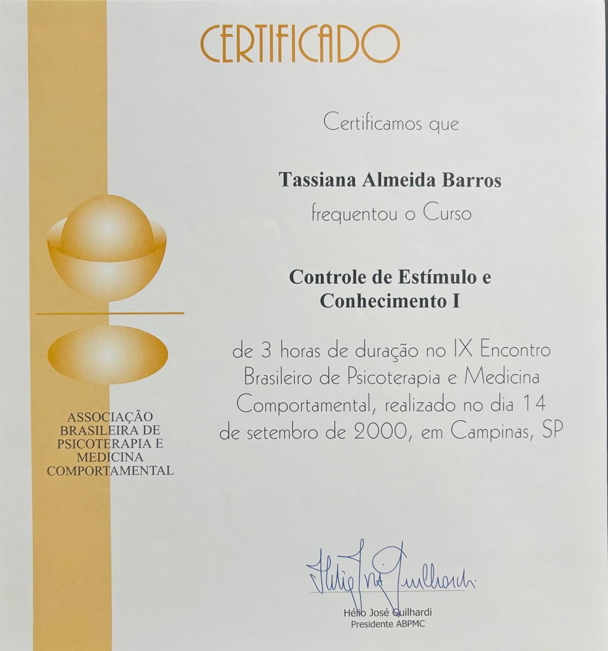 Quais são as principais especialidades de Tassiana Barros?Tassiana Barros é psicóloga. Te mostramos alguns dos serviços oferecidos pelo especialista graças à sua trajetória e vasta experiência: Terapia Cognitivo Comportamental, Coaching de relacionamento, Coaching executivo, Coaching de emagrecimento, Análise de perfil comportamental, Orientação Vocacional.