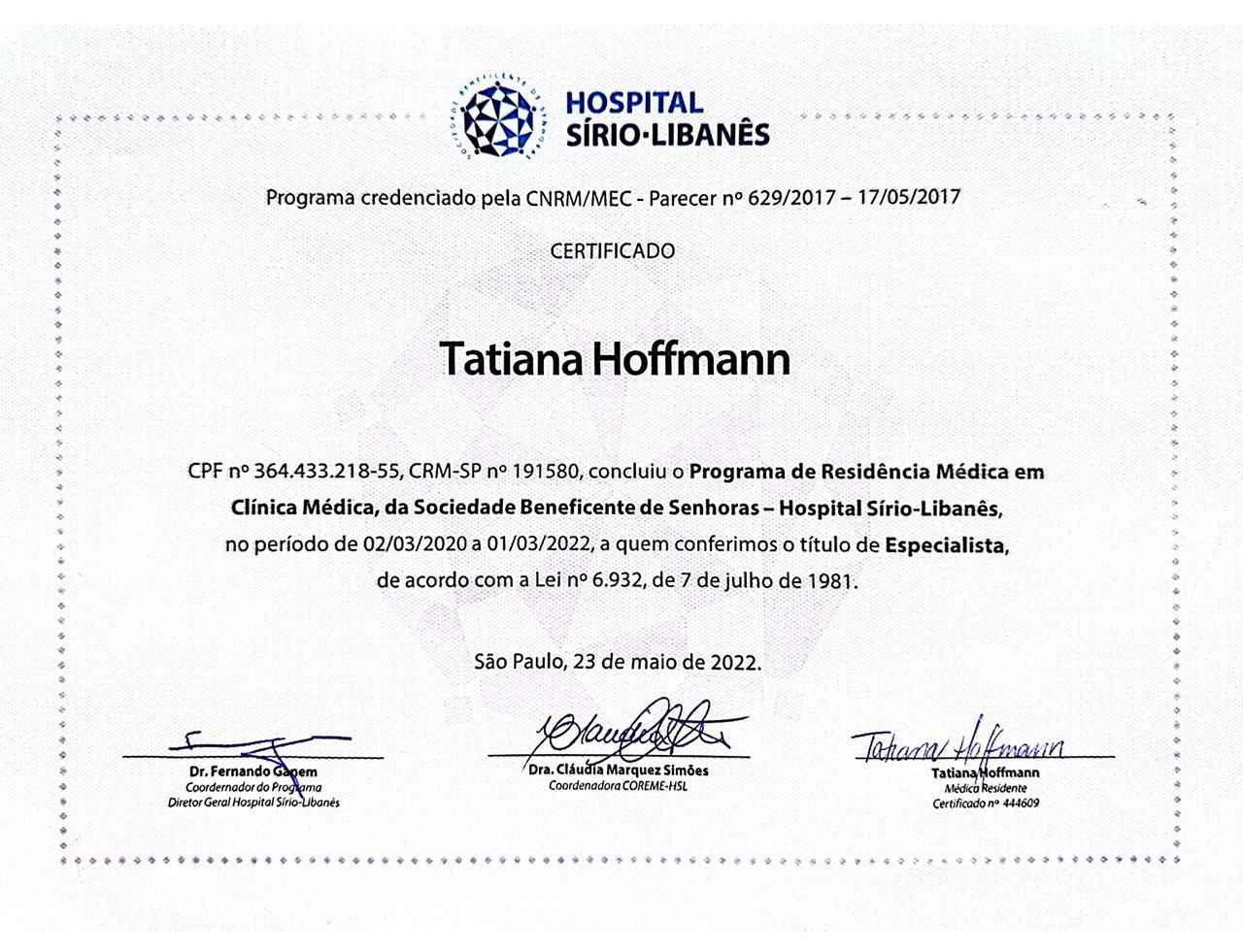 Me formei em Medicina pela Escola Paulista de Medicina (UNIFESP) e em Clínica Médica pelo Hospital Sírio-Libanês.