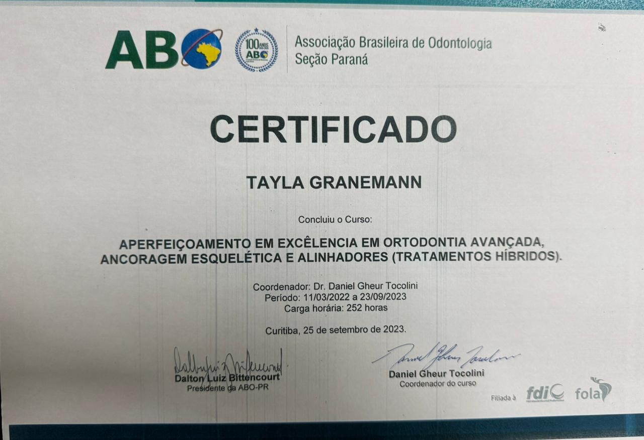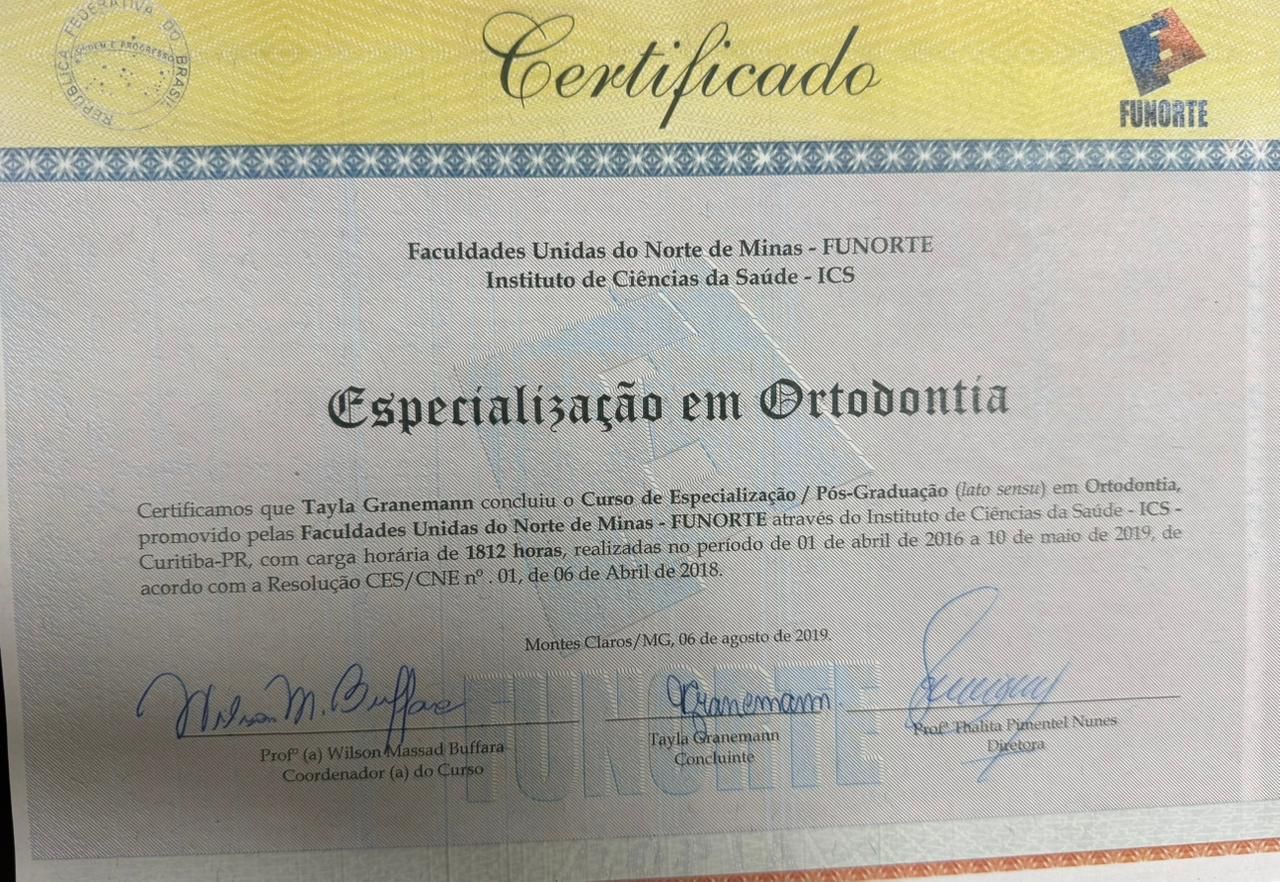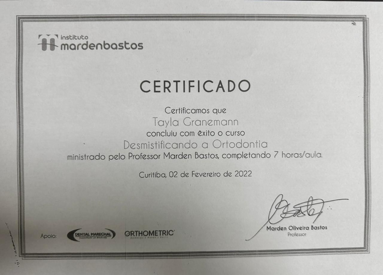 Quais são as principais especialidades de Tayla Granemann Jede?Tayla Granemann Jede é ortodontista, dentista. Te mostramos alguns dos serviços oferecidos pelo especialista graças à sua trajetória e vasta experiência: Clareamento dental a laser, Consulta Odontológica, Profilaxia dental (limpeza), Extração do siso, Primeira consulta Odontológica, Avaliação para Implantes, Manutenção de aparelho fixo, Instalação das contenções/profilaxia, Colagem do aparelho fixo, Exodontia.