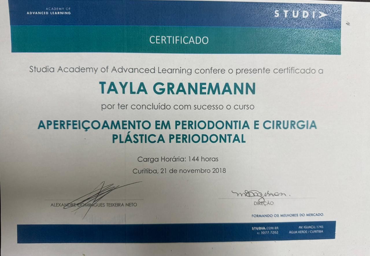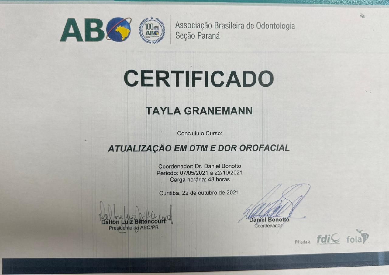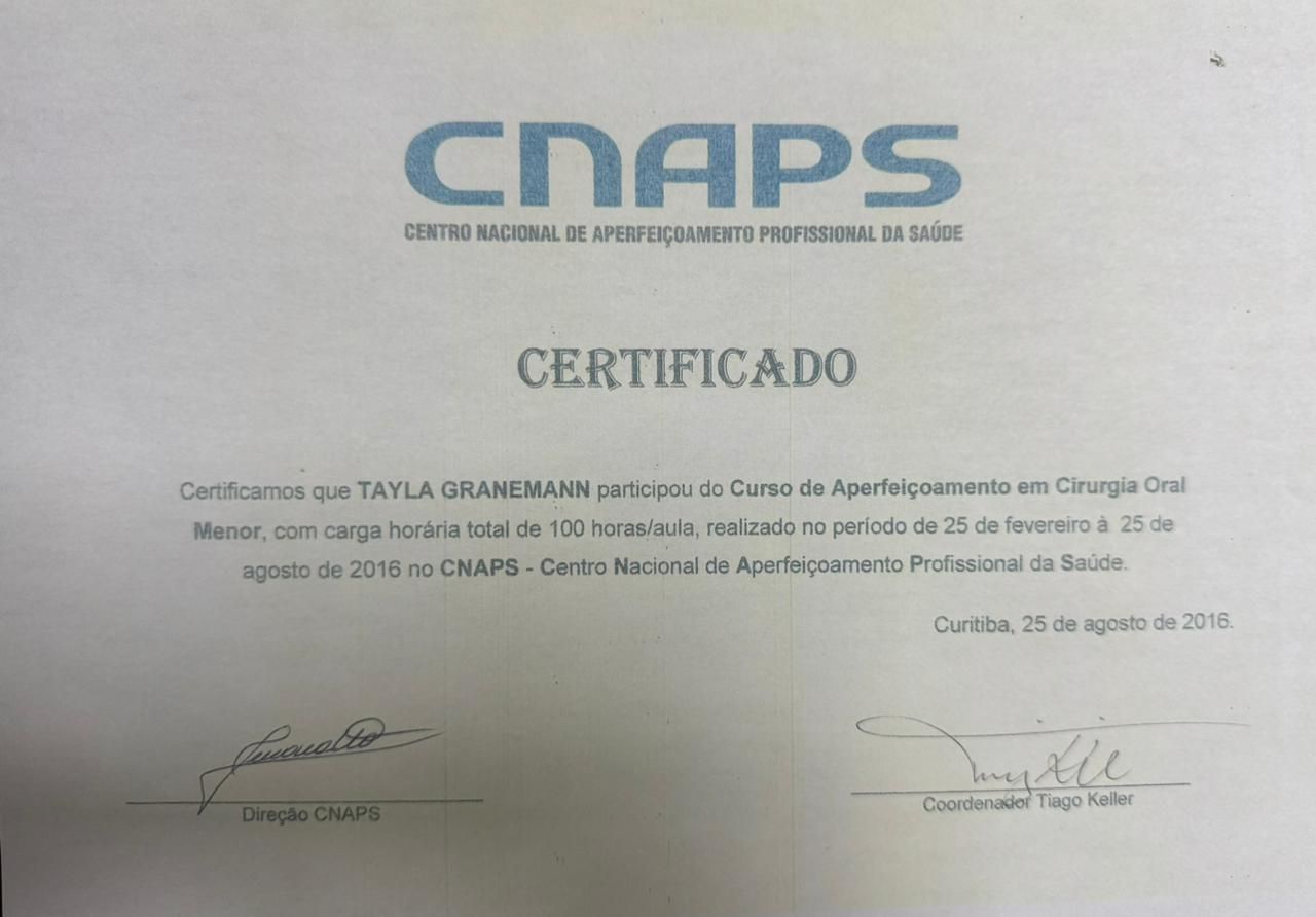 Quais são as principais especialidades de Tayla Granemann Jede?Tayla Granemann Jede é ortodontista, dentista. Te mostramos alguns dos serviços oferecidos pelo especialista graças à sua trajetória e vasta experiência: Clareamento dental a laser, Consulta Odontológica, Profilaxia dental (limpeza), Extração do siso, Primeira consulta Odontológica, Avaliação para Implantes, Manutenção de aparelho fixo, Instalação das contenções/profilaxia, Colagem do aparelho fixo, Exodontia.