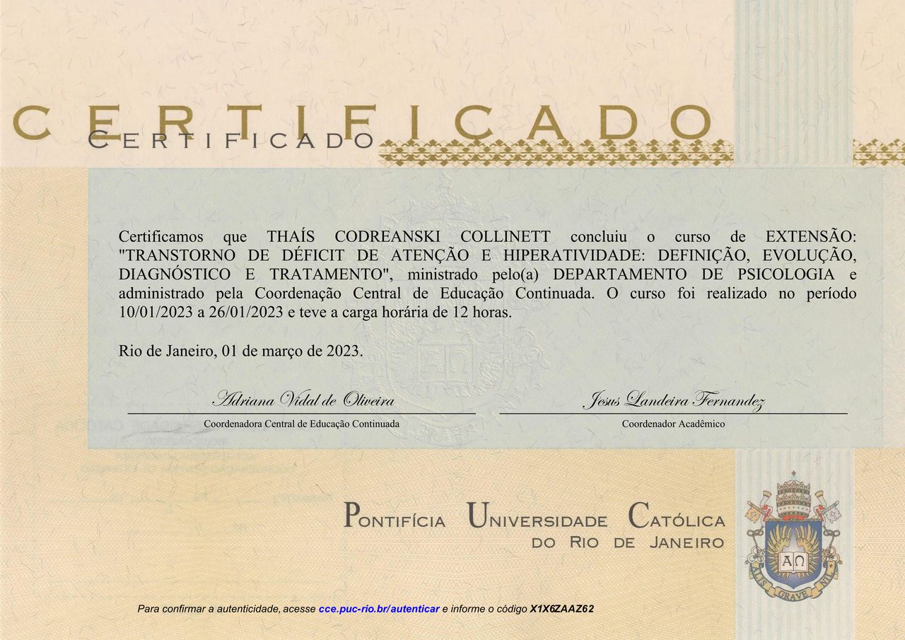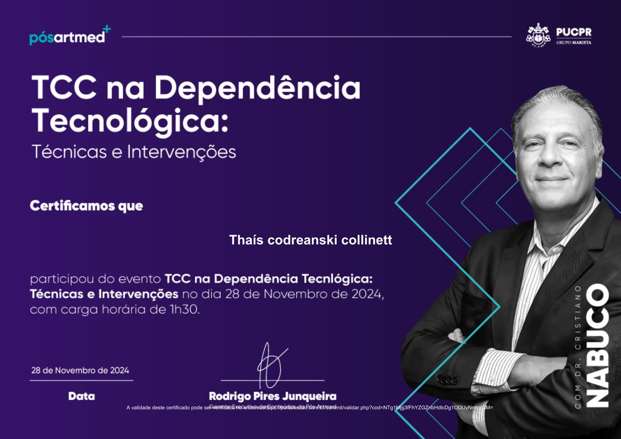 Quais são as principais especialidades de Thaís Collinett?Thaís Collinett é psicóloga. Te mostramos alguns dos serviços oferecidos pelo especialista graças à sua trajetória e vasta experiência: Terapia Cognitivo Comportamental, Psicoterapia, Atendimento Online em Psicoterapia, Atendimento psicológico online.