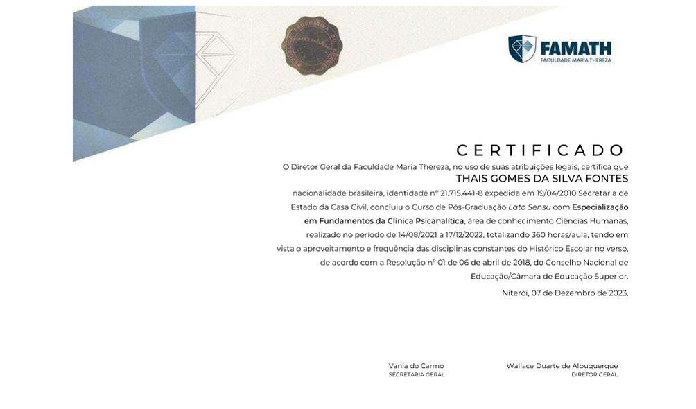 Quais são as principais especialidades de Thais Gomes?Thais Gomes é psicólogo, psicanalista. Te mostramos alguns dos serviços oferecidos pelo especialista graças à sua trajetória e vasta experiência: Primeira consulta psicologia, Psicoterapia, Tratamento da ansiedade, Psicanálise, Consulta psicológica do adulto, Consulta psicológica do idoso, Tratamento da depressão, Consulta psicológica do adolescente, Sessão online, Teleconsulta.