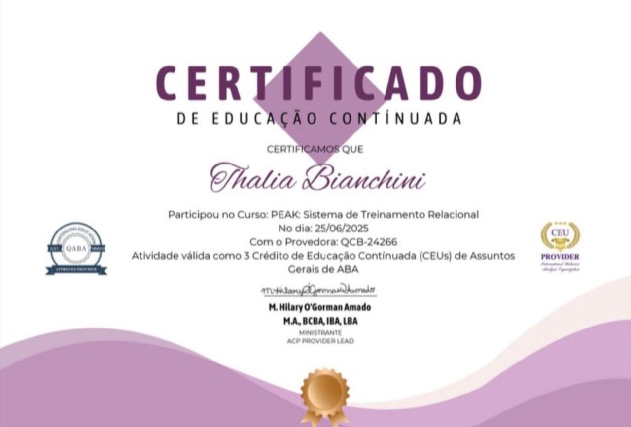 Quais são as principais especialidades de Thalia Bianchini?Thalia Bianchini é psicóloga. Te mostramos alguns dos serviços oferecidos pelo especialista graças à sua trajetória e vasta experiência: Primeira consulta psicologia, Avaliações para diagnostico TEA (autismo) crianças; adolescentes e adultos, Avaliação psicológica, Atendimento psicológico online.