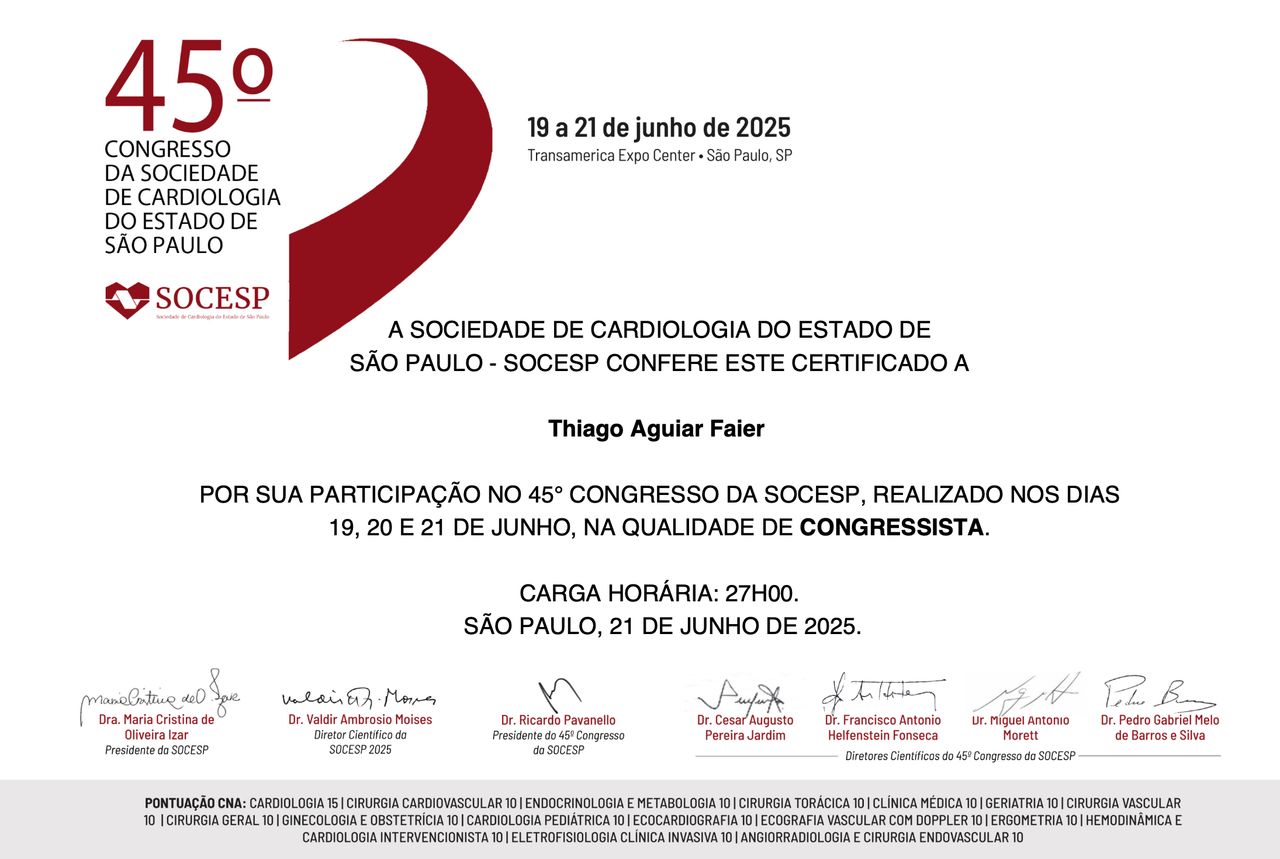 Quais são as principais especialidades de Thiago Faier?Thiago Faier é cardiologista, especialista em clínica médica. Te mostramos alguns dos serviços oferecidos pelo especialista graças à sua trajetória e vasta experiência: Consulta Cardiologia, Retorno de consulta, Primeira consulta Cardiologia, Risco cirúrgico.