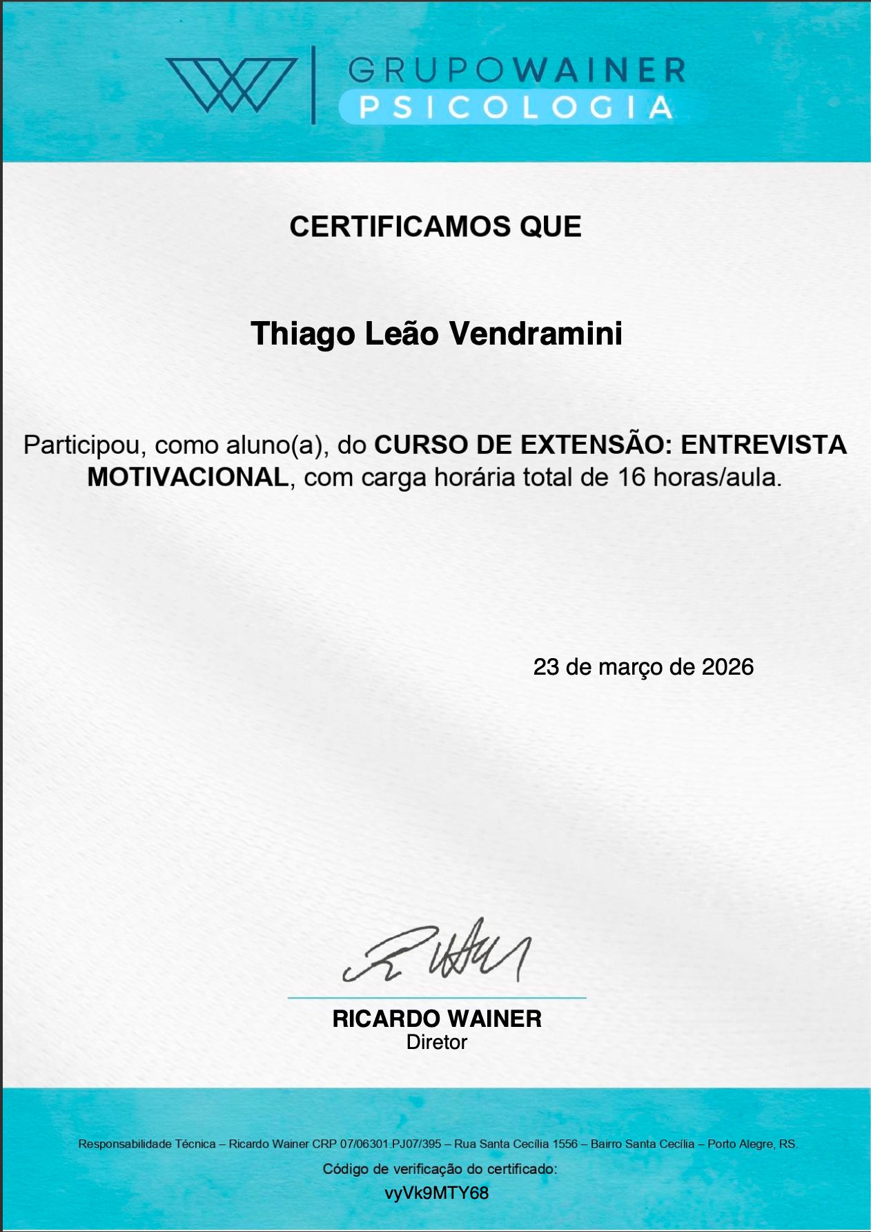 Tive uma experiência muito boa com o Thiago Vendramini. Desde o início ele foi super atencioso, tranquilo e me deixou bem à vontade pra conversar.
