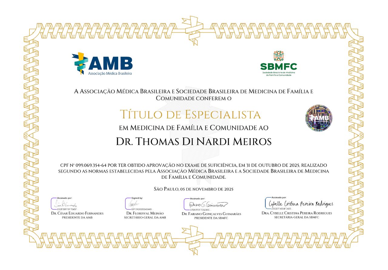Quais são as principais especialidades de Thomas Di Nardi Medeiros?Thomas Di Nardi Medeiros é médico de família, generalista. Te mostramos alguns dos serviços oferecidos pelo especialista graças à sua trajetória e vasta experiência: Teleconsulta, Tratamento da insônia, Tratamento da síndrome do pânico, Transtorno de déficit de atenção e hiperatividade - TDAH, Primeira consulta Psiquiatria, Retorno de consultas Psiquiatria, Tratamento do transtorno de estresse pós-traumático, Tratamento para Transtorno Disfórico, Tratamento Adicção, Tratamento para anorexia nervosa.
