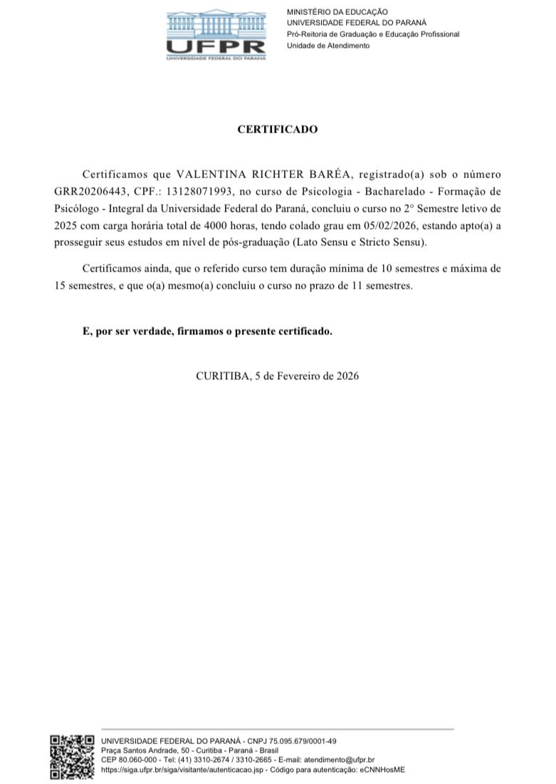 Sou psicóloga formada pela UFPR e atuo com base na psicanálise. Realizo formação contínua em psicanálise, participando de grupos de estudos e transmissão, supervisão, análise pessoal e pós graduação. Atendo pacientes de todas as idades a partir dos 3 anos. Acredito no poder da escuta e da palavra como cura e transformação.