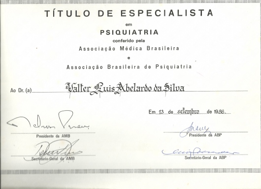 Quais são as principais especialidades de Valter Abelardino?Valter Abelardino é psiquiatra, especialista em medicina preventiva. Te mostramos alguns dos serviços oferecidos pelo especialista graças à sua trajetória e vasta experiência: Interconsulta Psiquiátrica, Parecer psiquiátrico, Laudo de sanidade mental para concurso, Consulta Psiquiatra, Teleconsulta, Consulta Psiquiatria.