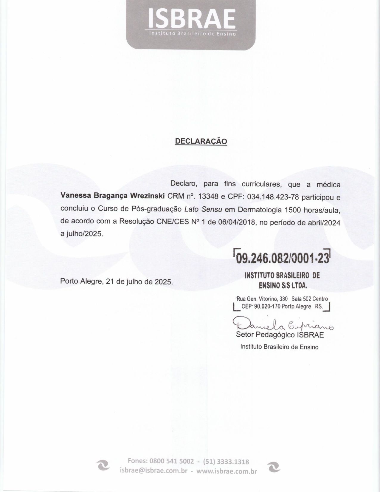 Posso passar por atendimento online com Vanessa Bragança Wrezinski, sem ter que ir até o consultório?Sim, Vanessa Bragança Wrezinski oferece atendimento online. Basta selecionar "Teleconsulta" ao agendar sua consulta e você poderá ver as datas e horários disponíveis.
