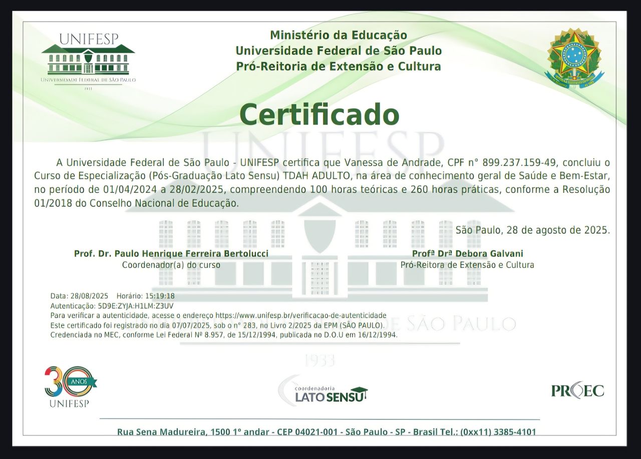 Realizou Pós Graduação Latu Sensu em Transtorno de Déficit de Atenção Adulto (UNIFESP-2025)