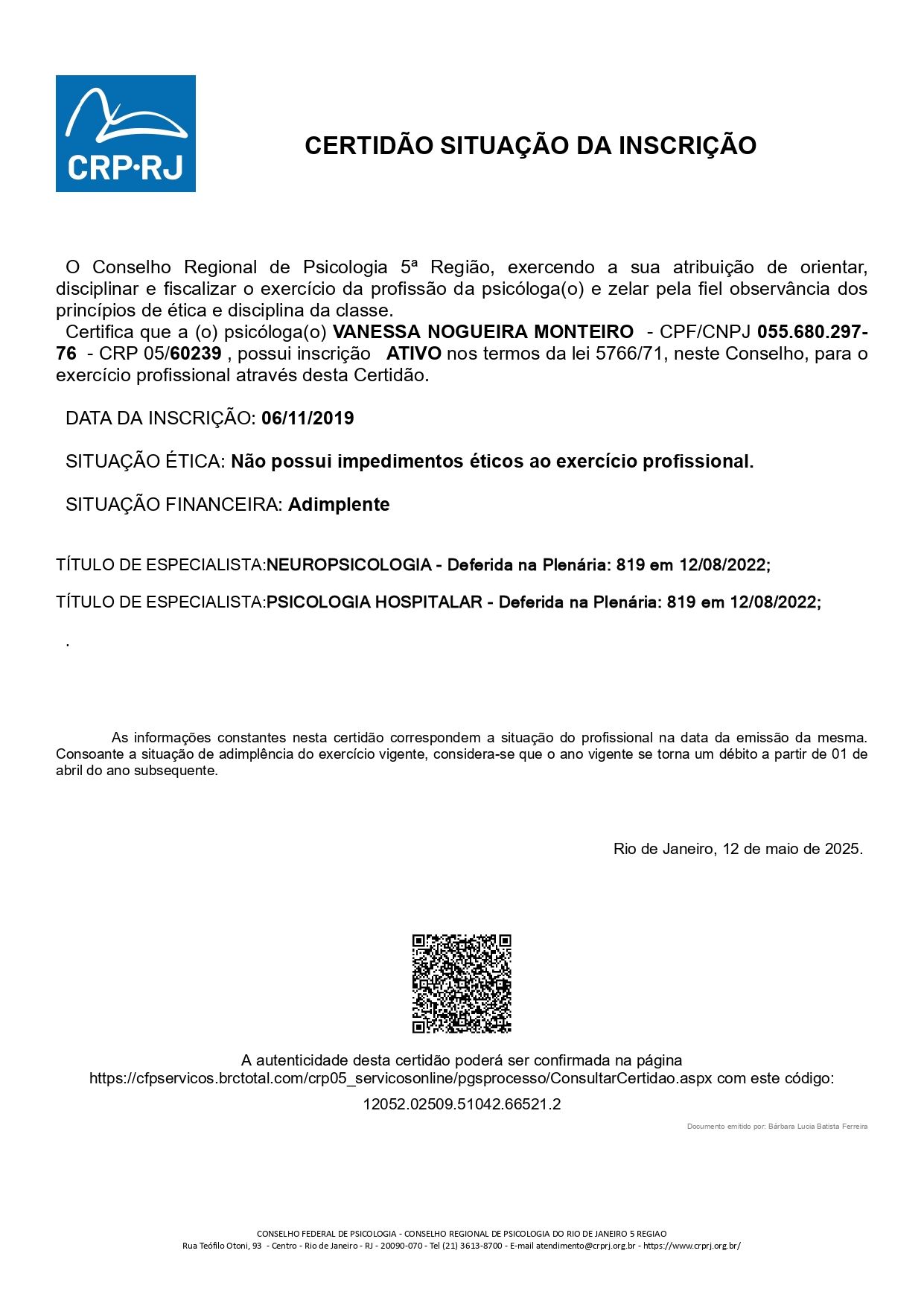 Número de registro: CRP RJ 60239