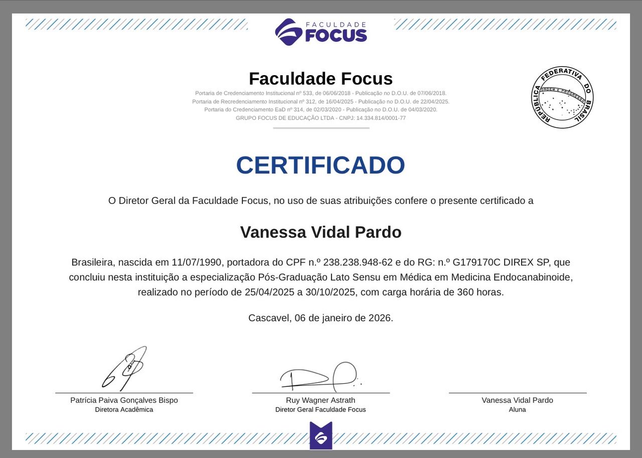 Meu trabalho é baseado na escuta qualificada e no acolhimento, buscando compreender cada pessoa para além dos sintomas, considerando sua história, contexto de vida e necessidades emocionais. Tenho formação complementar em psicoterapia e em medicina endocanabinoide.