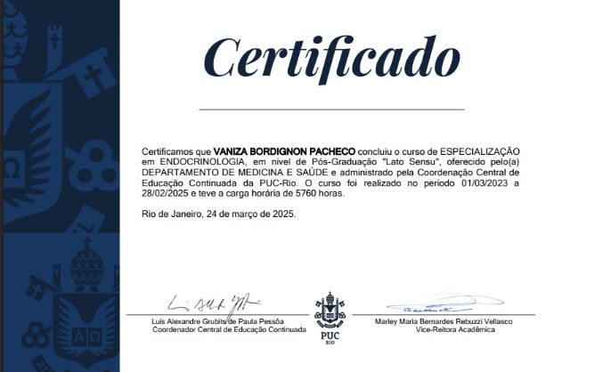 Quais são as principais especialidades de Vaniza Bordignon Pacheco?Vaniza Bordignon Pacheco é endocrinologista, especialista em clínica médica. Te mostramos alguns dos serviços oferecidos pelo especialista graças à sua trajetória e vasta experiência: Consulta particular, Consulta de emagrecimento, Consulta de rotina, Tratamento pré-diabetes, Tratamento de obesidade, Osteoporose - diagnóstico e tratamento, Tratamento diabetes mellitus, obesidade e síndrome metabólica, Tratamento de diabetes, Acompanhamento de pessoas transgêneras, Acompanhamento com endocrinologista no pós-operatório de cirurgia bariátrica.
