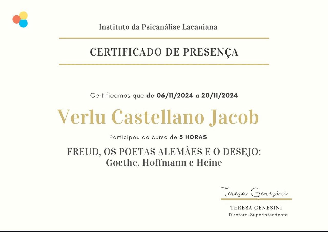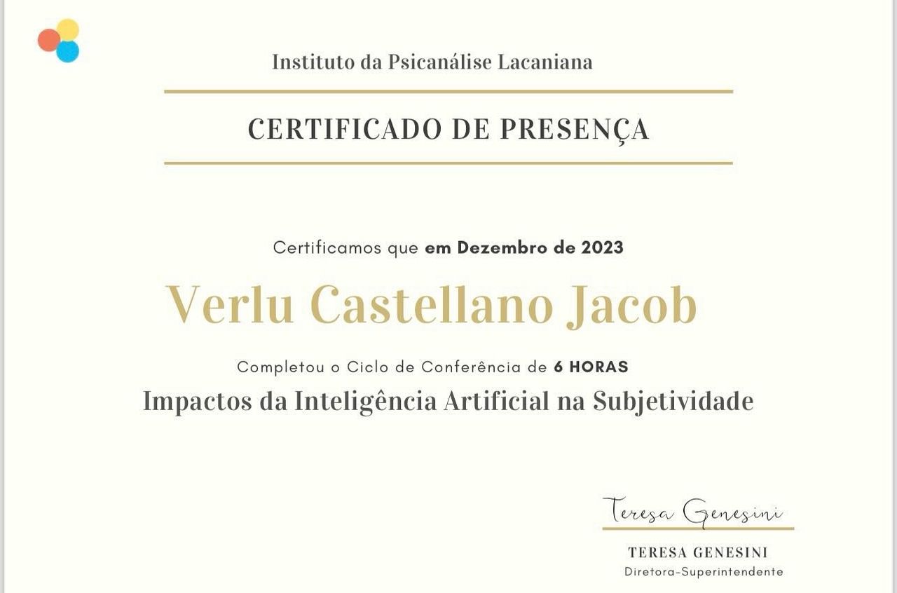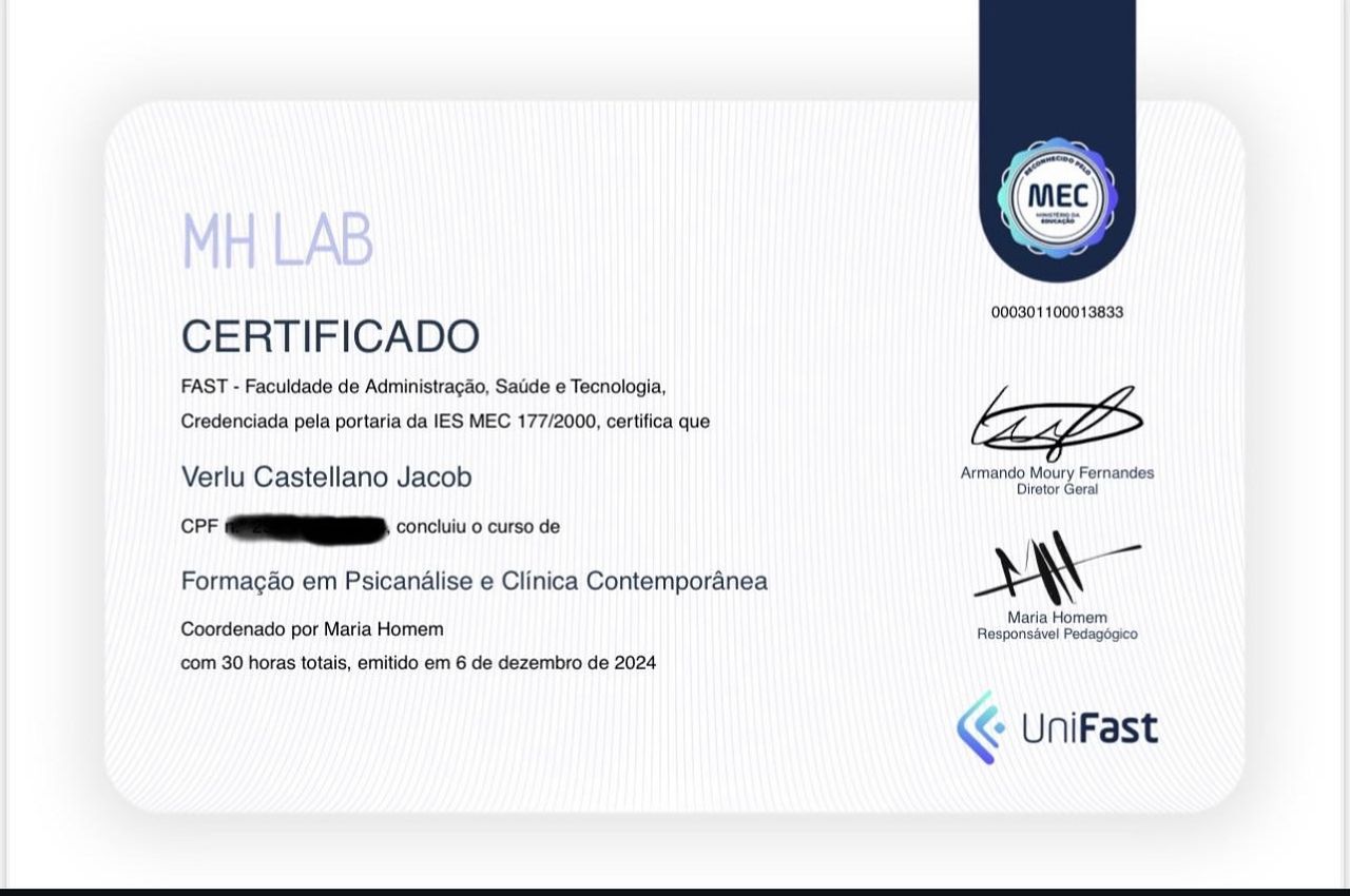 Quais são as principais especialidades de Verlu Castellano Jacob?Verlu Castellano Jacob é psicanalista. Te mostramos alguns dos serviços oferecidos pelo especialista graças à sua trajetória e vasta experiência: Psicanálise, Telemedicina Ajuda RS, Entrevista inicial, Teleconsulta, Atendimento psicanalítico online para brasileiros que moram no exterior.