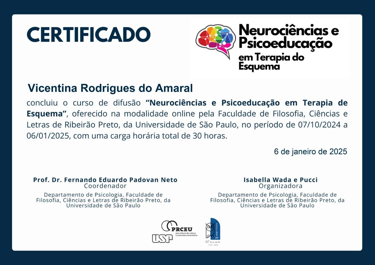Atualmente, realizo avaliação neuropsicológica (crianças, adultos e idosos) e ofereço psicoterapia individual para adolescentes, adultos e idosos na abordagem Cognitivo-Comportamental (TCC) e Análise do comportamento aplicada ( terapia ABA).