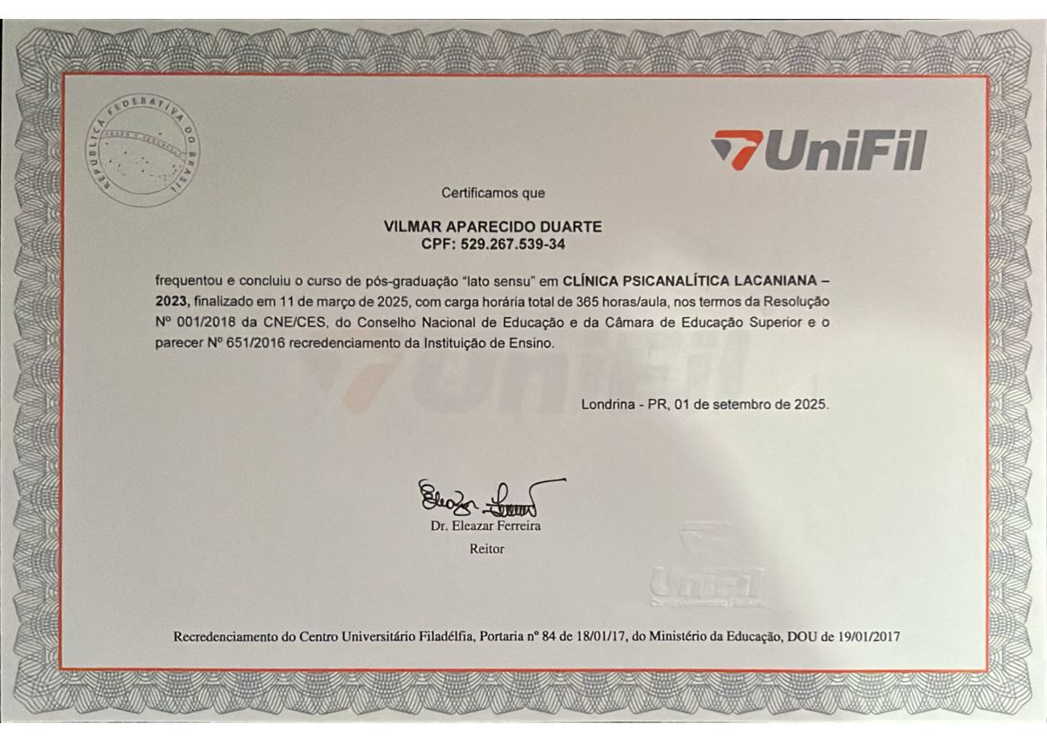 Pós graduado em Psicanálise Clínica com Extensão em Técnicas de Intervenção Psicanalítica Contemporânea, com experiência em casos de ansiedade, estresse, autoconhecimento, gestão emocional. Atendimentos ON-LINE com escuta ética e responsável.