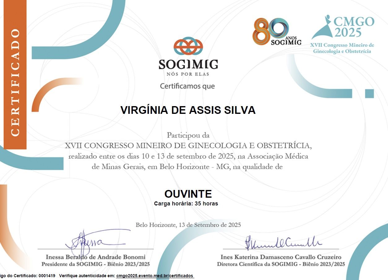 Médica formada pela Universidade Federal de Minas Gerais (UFMG). Ginecologista e Obstetra formada pelo Hospital das Clínicas da UFMG. Título de Especialista em Ginecologia e Obstetrícia (TEGO) pela Sociedade Brasileira de Ginecologia e Obstetrícia (FEBRASGO). Atuo na Rede MaterDei de Saúde em Belo Horizonte e na clínica Lily Ginecologia e Obstetrícia.