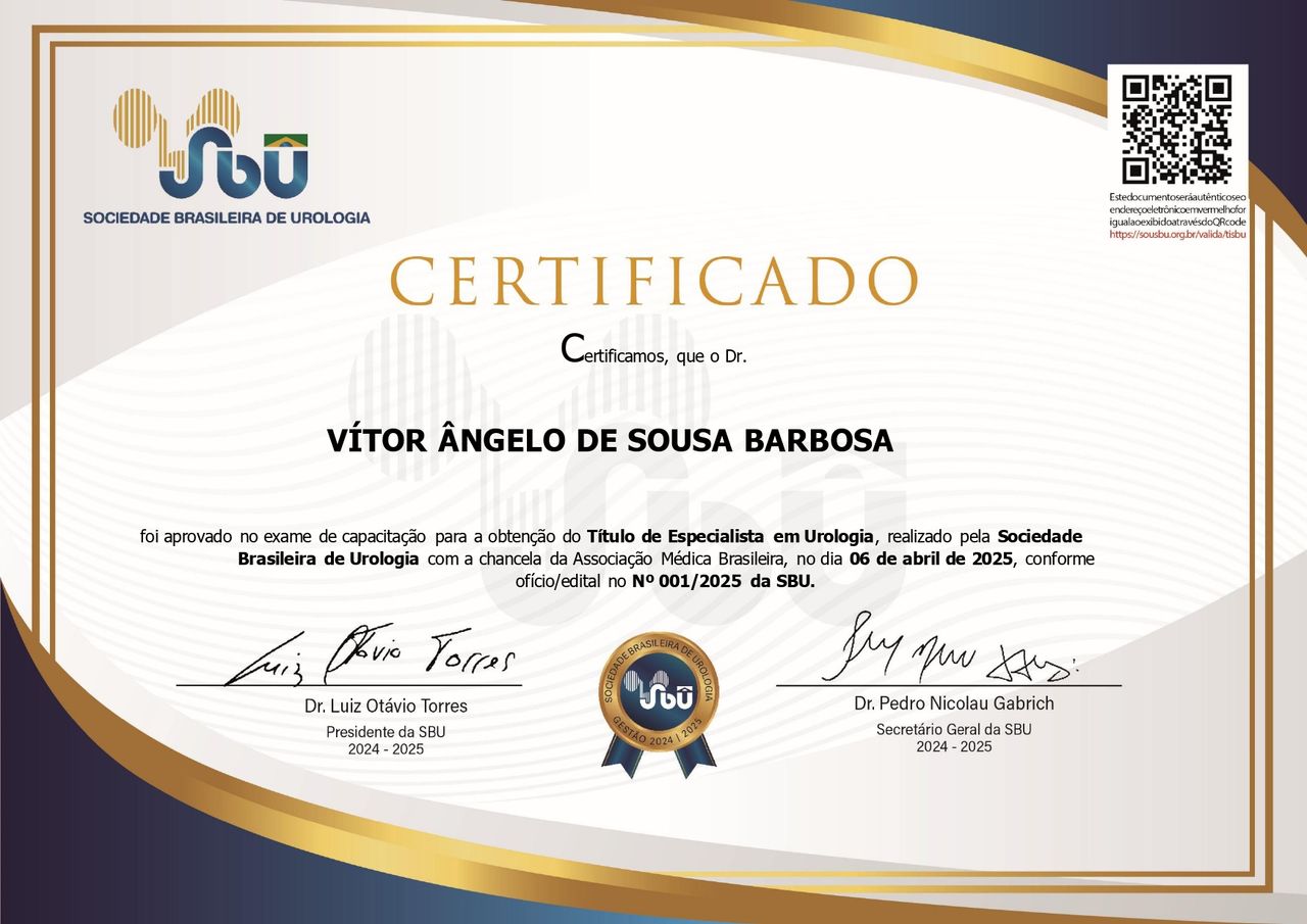 Quais são as principais especialidades de Vítor Ângelo de S. Barbosa?Vítor Ângelo de S. Barbosa é urologista. Te mostramos alguns dos serviços oferecidos pelo especialista graças à sua trajetória e vasta experiência: Primeira consulta Urologia, Avaliação para Vasectomia, Cistoscopia com biopsia de bexiga, Prótese peniana, Ressecção Endoscopica De Tumor Vesical, Distúrbios da libido, Check up, Reposição hormonal masculina, Circuncisão, Vasectomia.