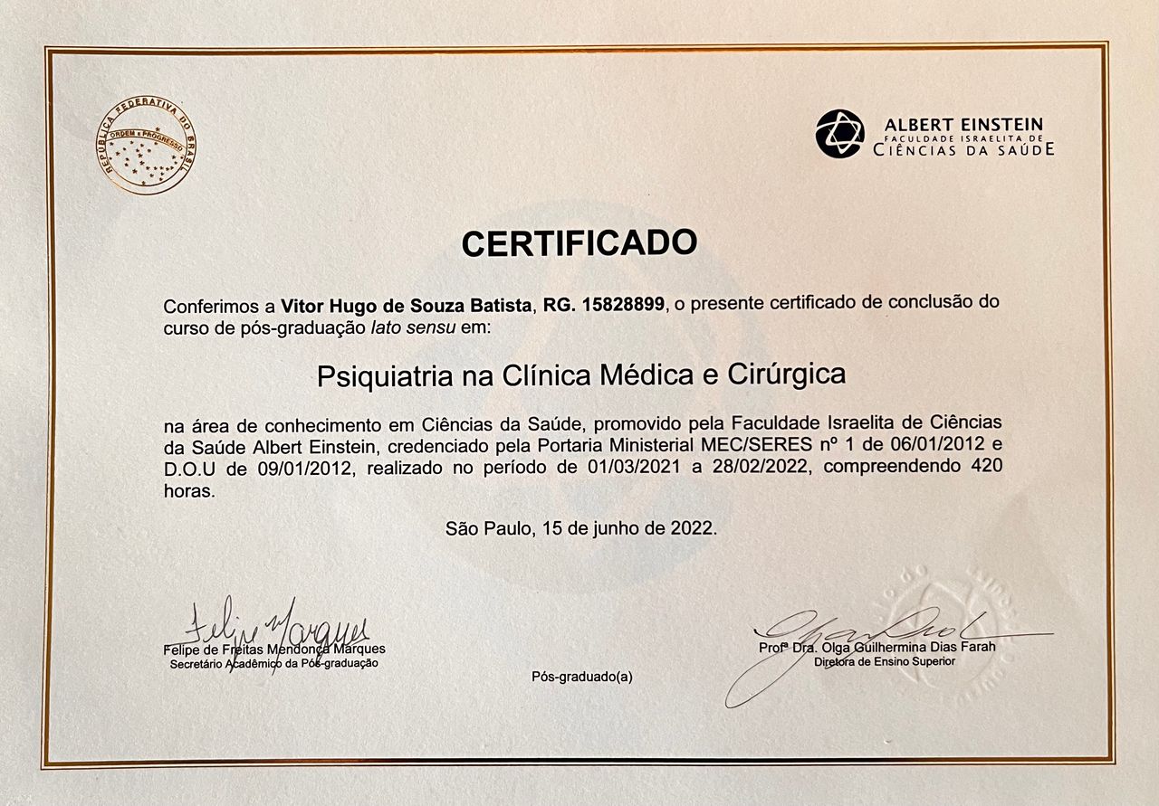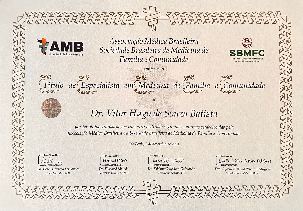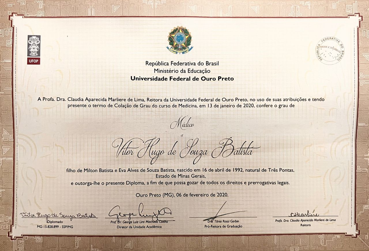 Olá, seja bem vindo(a)! Sou Vitor Hugo, médico formado pela Universidade Federal de Ouro Preto, pós-graduado em Psiquiatria pelo Instituto Albert Eistein e especialista em Medicina de Família e Comunidade pela Sociedade Brasileira de Medicina de Família e Comunidade.