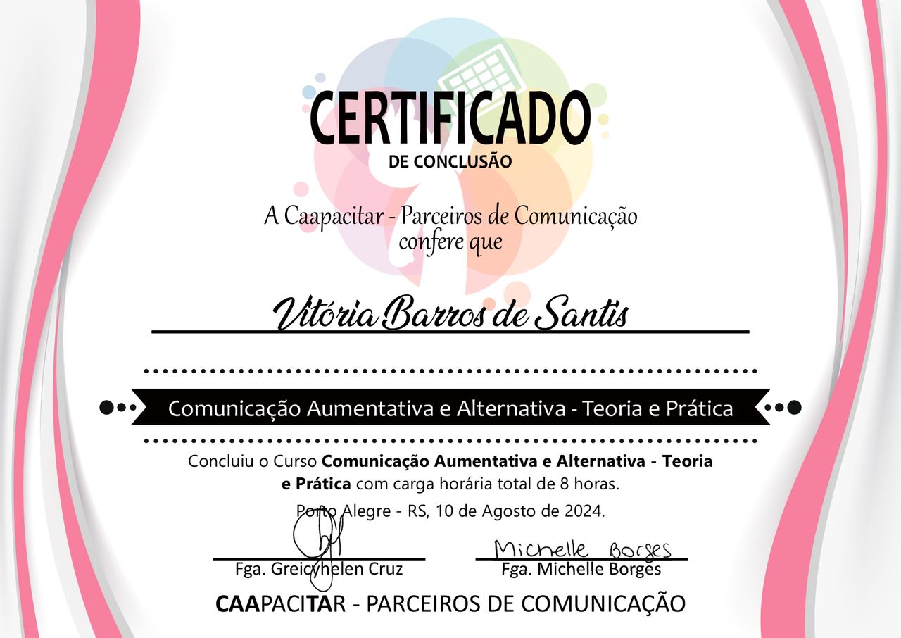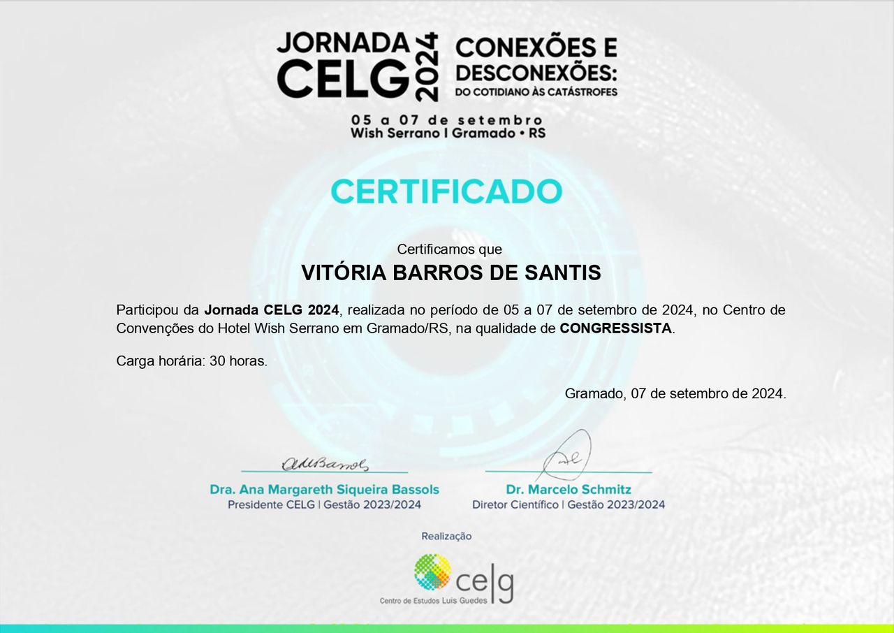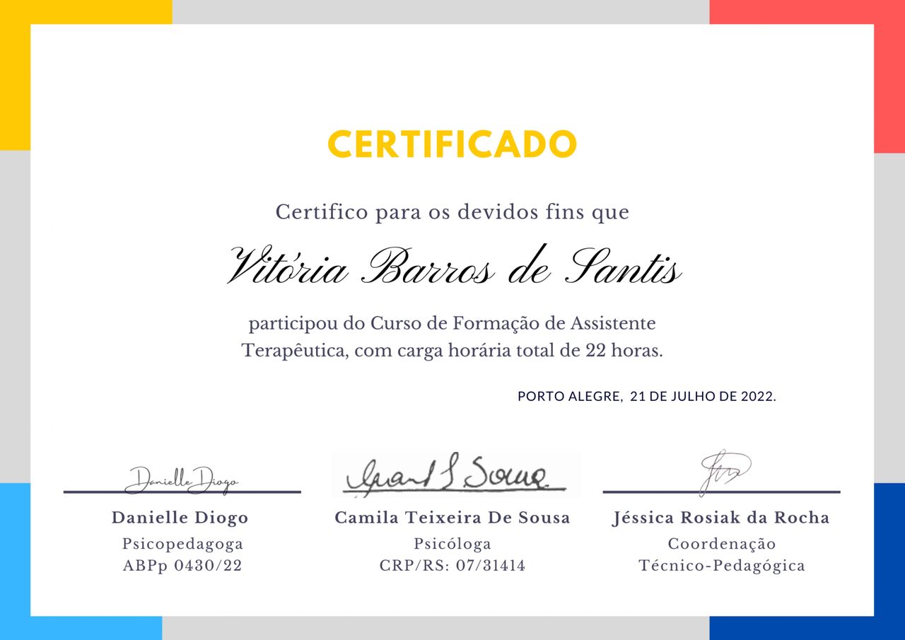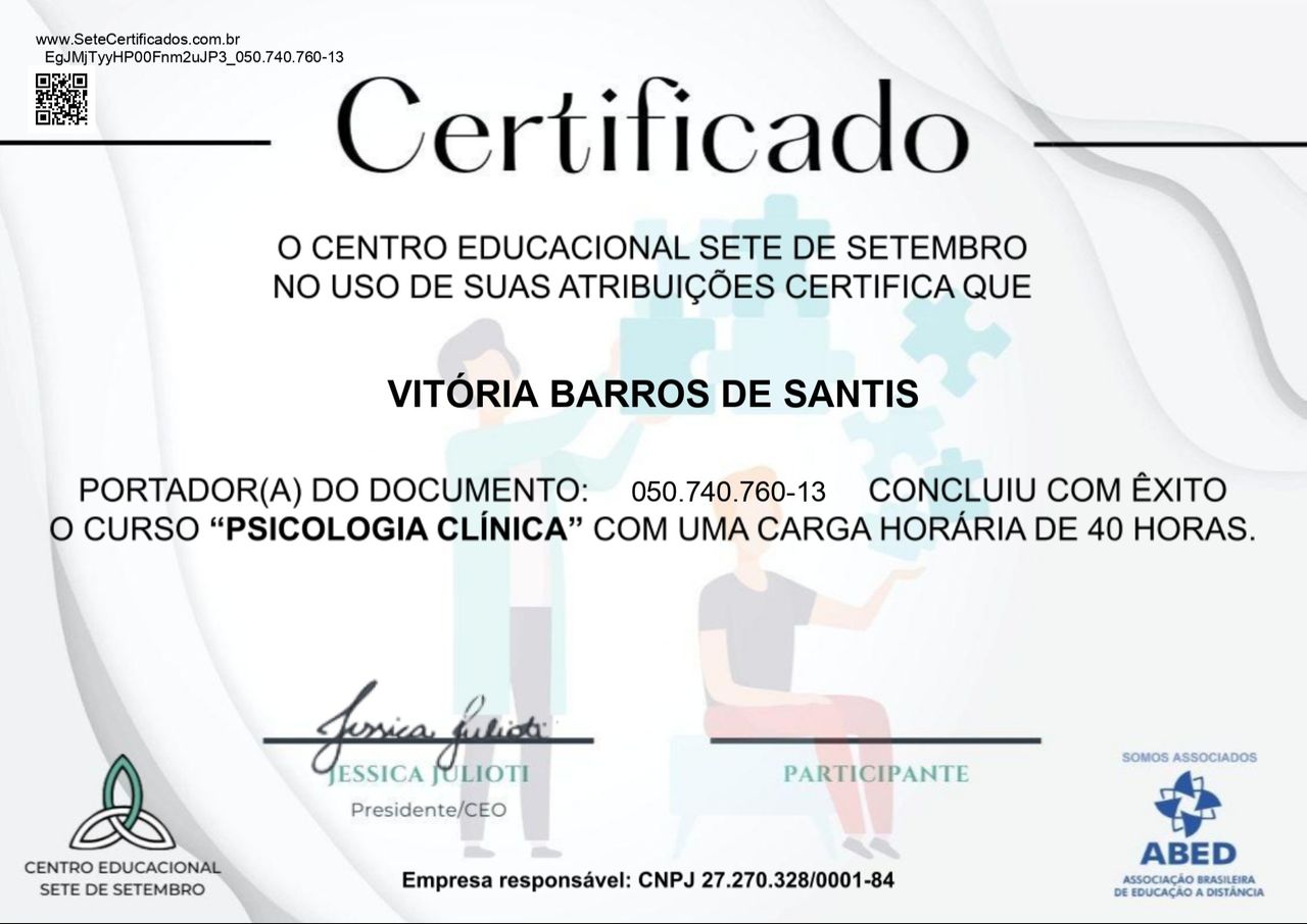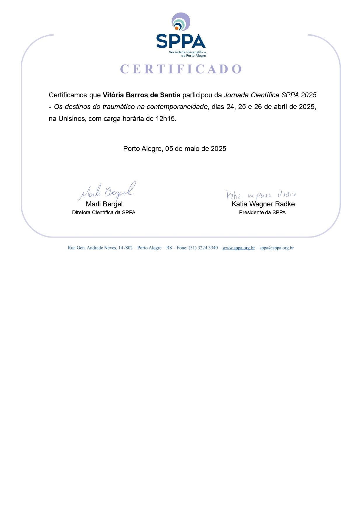 Sou Vitória Barros de Santis, Psicóloga Clínica formada pela Universidade Federal do Rio Grande do Sul (UFRGS) e em especialização em Psicoterapia de Orientação Psicanalítica pelo CELG (Centro de Estudos Luís Guedes).