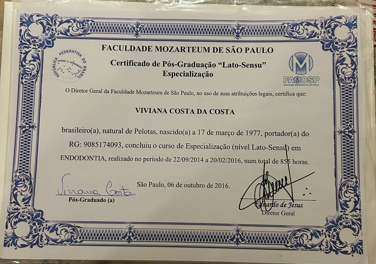 Quais são as principais especialidades de Viviana Costa Da Costa?Viviana Costa Da Costa é dentista. Te mostramos alguns dos serviços oferecidos pelo especialista graças à sua trajetória e vasta experiência: Primeira consulta Odontológica, Aparelho ortodôntico, Colocação de prótese dentária (moldagem), Clareamento dental, Aplicação da toxina botulínica, Restauração em resina, Endodontia.
