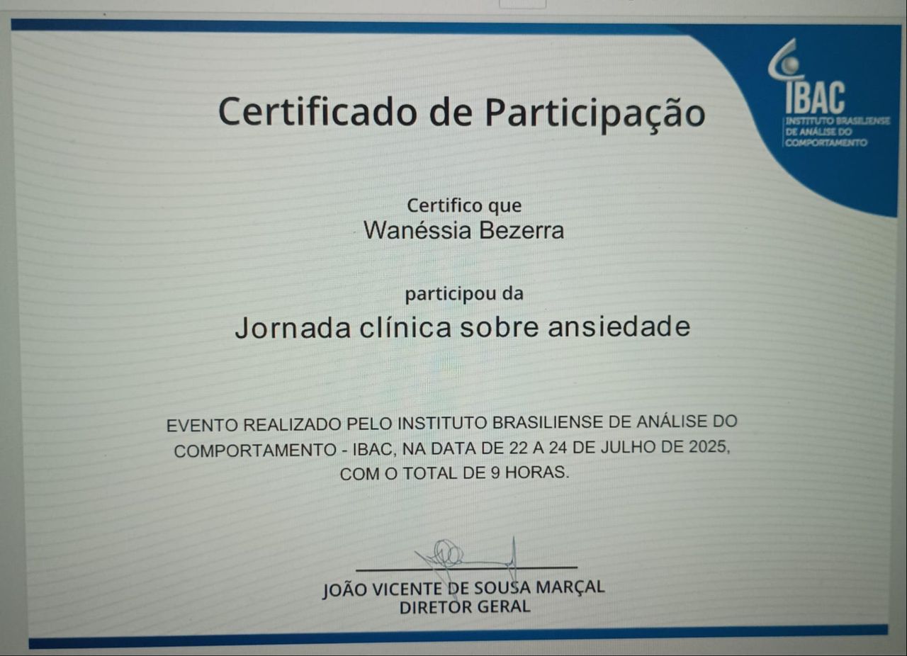 Olá, eu sou a Wanéssia Bezerra, Psicóloga clínica e Neuropsicóloga. Minha abordagem de atendimento é comportamental pela perspectiva da Terapia de Aceitação e Compromisso (ACT). A ACT é uma intervenção baseada em evidências, com foco no desenvolvimento da flexibilidade psicológica. A ACT é uma forma de lidar com os pensamentos e sentimentos difíceis. Ela ensina a aceitar o que você não pode mudar, se comprometer com o que importa para você e viver uma vida com mais significado.