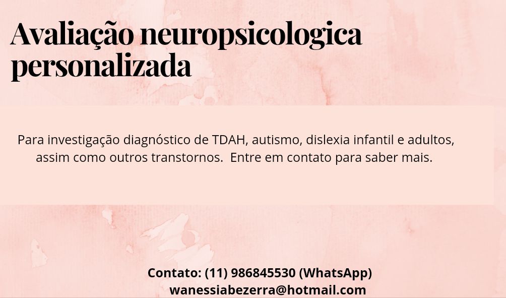 Realizo avaliação neuropsicológica online TDAH, TEA, além de transtorno de personalidade e TAG em adultos de todo o Brasil e brasileiros que moram no exterior. Proporcione cuidado a sua saúde mental de forma personalizada e remota.