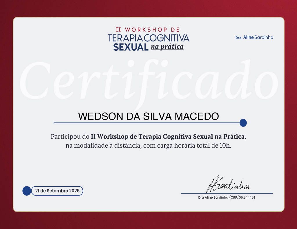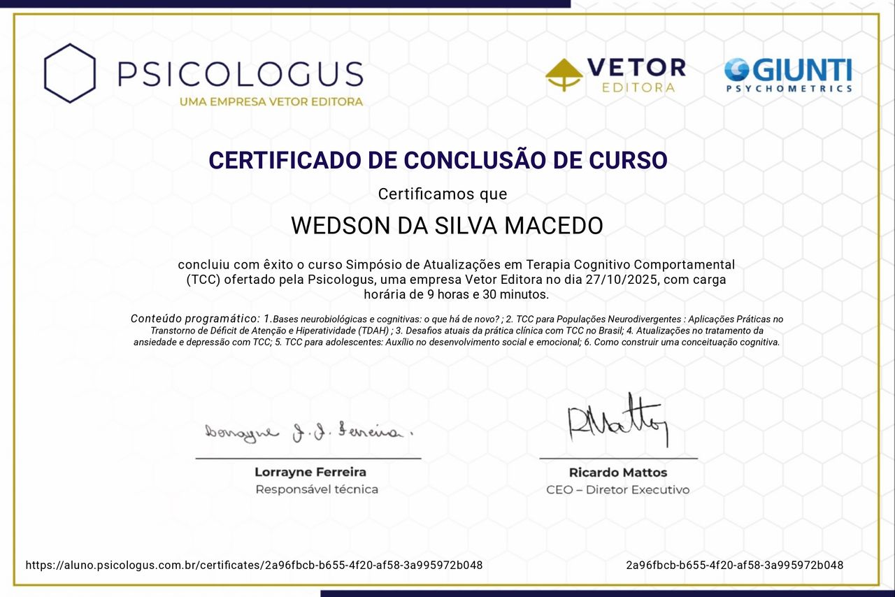 Quais são as principais especialidades de Wedson Silva?Wedson Silva é psicólogo. Te mostramos alguns dos serviços oferecidos pelo especialista graças à sua trajetória e vasta experiência: Teleconsulta, Atendimento Online em Psicoterapia, Atendimento Psicológico online para adulto, Psicoterapia online, Terapia online, Atendimento psicológico online, Psicoterapia, Tratamento da ansiedade, Análise do Comportamento Aplicada (ABA), Avaliação psicológica.