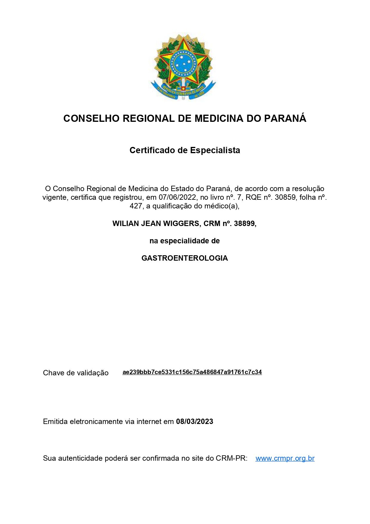 Número de registro: CRM PR 38899 - RQE Endoscopista não encontrado RQE Nº: 30859