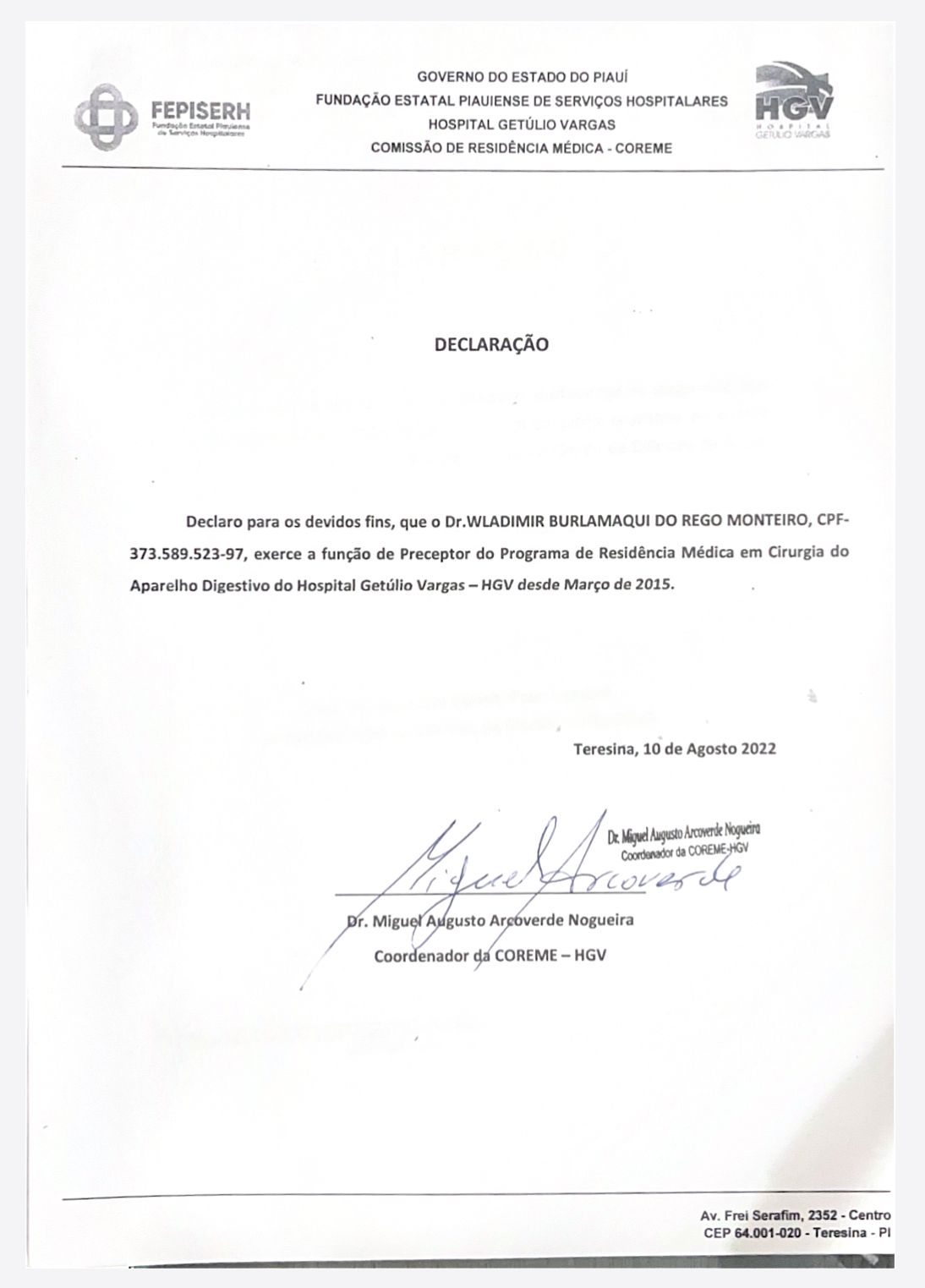 Gastroenterologista, Cirurgião do Aparelho Digestivo, Endoscopista com foco em Vias Biliares (CPRE) (PAPILOTOMIA ENDOSCÓPICA) Formado em Medicina pela FCMUPE - Recife -PE Residência Médica em Cirurgia Geral e em Cirurgia do Aparelho Digestivo (UFPI). Curso e Treinamento em Cirurgia Video Laparocópica pela HC -FMUSP Residência Médica de Especialização em Endoscopia Digestiva, Vias Biliares e Pâncreas pelo Hospital Sirio Libanês - SP. Pós Graduação em Coloproctologia pelo IEP-Hosp. Sírio Libanês-SP. Título de Especialista e TITULAR pela AMB e Sociedades PERORAL, SOBED, CBCD e FBG, Título de Capacitação em Cirurgia Oncológica do Aparelho Digestivo (AMB- CBCD) Ex Professor de Anatomia pela Faculdade de Medicina da UESPI. Preceptor da Residência Medica de Cirurgia do Ap. Digestiva e Endoscopia no Hospital Getúlio Vargas (UESPI). Avaliador e Presidente de Banca Examinadora para obetencao de título de especialista em cirúrgica digestiva.