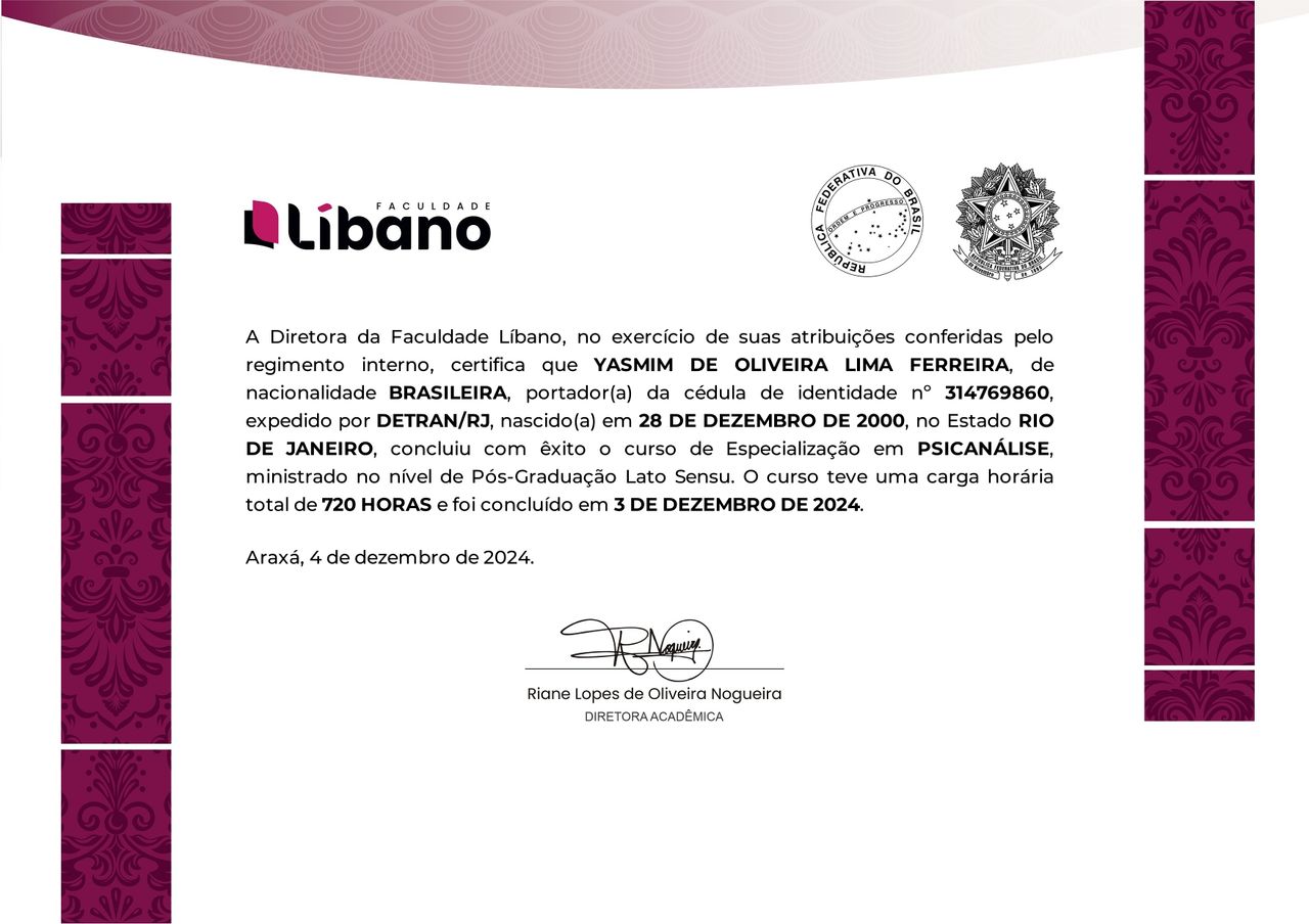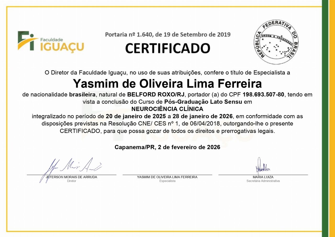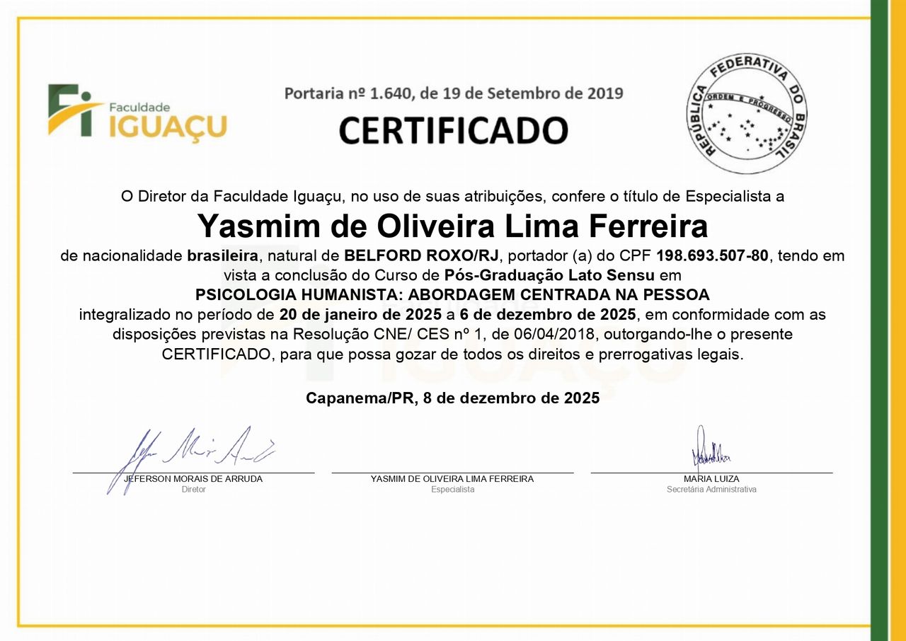 Olá! Meu nome é Yasmim Ferreira, sou Psicóloga e Neuropsicóloga. Atuo com psicoterapia e avaliação psicológica de forma presencial e online. Sou especialista em neuropsicologia e meu objetivo é voltado para a compreensão integral do funcionamento cognitivo, emocional e comportamental, oferecendo avaliações éticas, cuidadosas e embasadas cientificamente, para que possa proporcionar o bem estar do paciente e ajudá-lo a criar um estilo e modo de vida mais saudáveis.