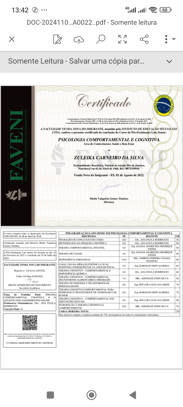 Quais são as principais especialidades de Zuleika Carneiro Silva?Zuleika Carneiro Silva é psicóloga. Te mostramos alguns dos serviços oferecidos pelo especialista graças à sua trajetória e vasta experiência: Teleconsulta, Análise do Comportamento Aplicada (ABA), Terapia Cognitiva, Consulta Psicologia, Psicoterapia, Tratamento da ansiedade, Avaliação de transtorno de TDAH, Acompanhamento a pacientes com: ansiedade,depressão, fobias e traumas psicológicos, Avaliação neuropsicológica, Terapia Cognitivo Comportamental.